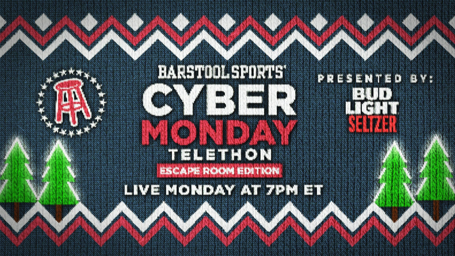 Tonight is our 5th annual Cyber Monday Telethon. Everything is 20% off at the Barstool store and as per tradition, we're adding some excitement to the mix. While some employees can't be bothered to tweet, I've been buried alive to sell merch. We almost killed General Smitty with a paintball gun. Last year we had Carrabis and White Sox Dave in a radar gun competition. This year it's a Barstool escape room, sponsored by Bud Light Seltzer.