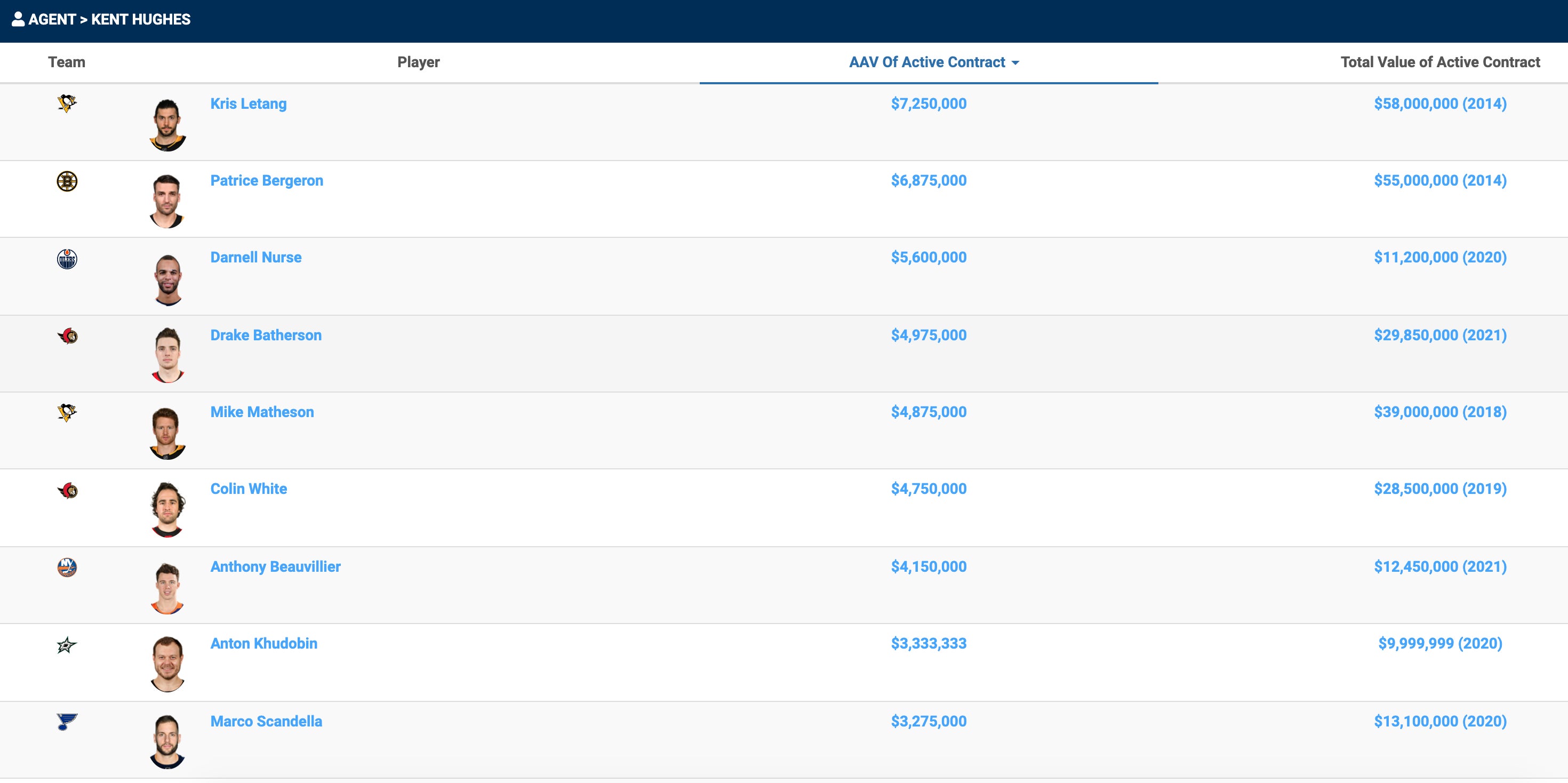 Kent Hughes is from Montreal so he speaky the French. Which is obviously high up on the priority list for the Canadiens. It definitely reduces the pool of candidates for the job, but there were still plenty of great options out there. I already mentioned Luongo. The Canadiens also interviewed Danny Briere and Mathieu Darche. But instead of going with a former NHL player, they opted to go with an NHL agent. Here's a quick list of some of the players represented by Kent Hughes, courtesy of PuckPedia.