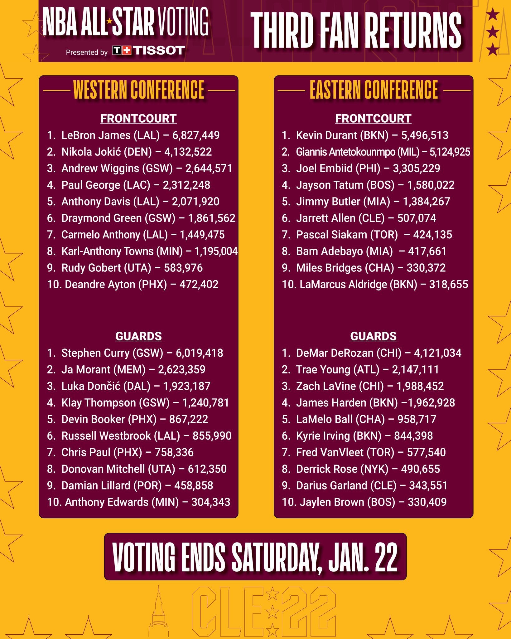 There's a strong chance I'm the only person on the planet that even cares about this NBA All Star Fan Vote. I get that. When I first blogged the initial results at the beginning of the month, it was more of the same. NBA fans are morons and nobody takes this seriously. It's a big time problem with giving fans such a heavy weighted percentage, and everyone knows it's a popularity contest.