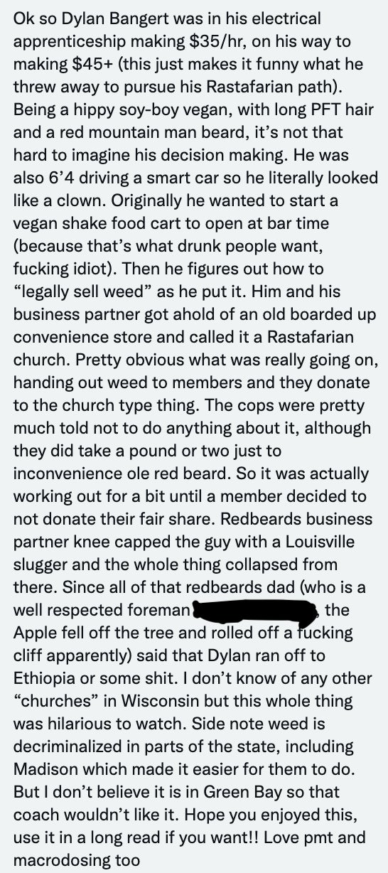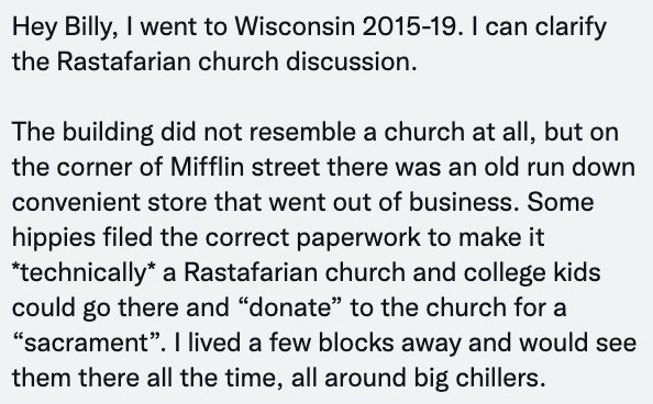 On Pardon My Take recently I remembered a story I had heard about Rastafarians selling weed out of churches in exchange for "Donations." According to my source there was a Church called "Lion of Judah: House Of Rastafari" in which individuals could sign a card to become members of the church and then receive "Sacrament" in the form of Marijuana as long as they "donated to the church." Due to weed being decriminalized in Madison, and the first amendment's role in freedom of religion, the police didn't really bother dealing with the whole situation.