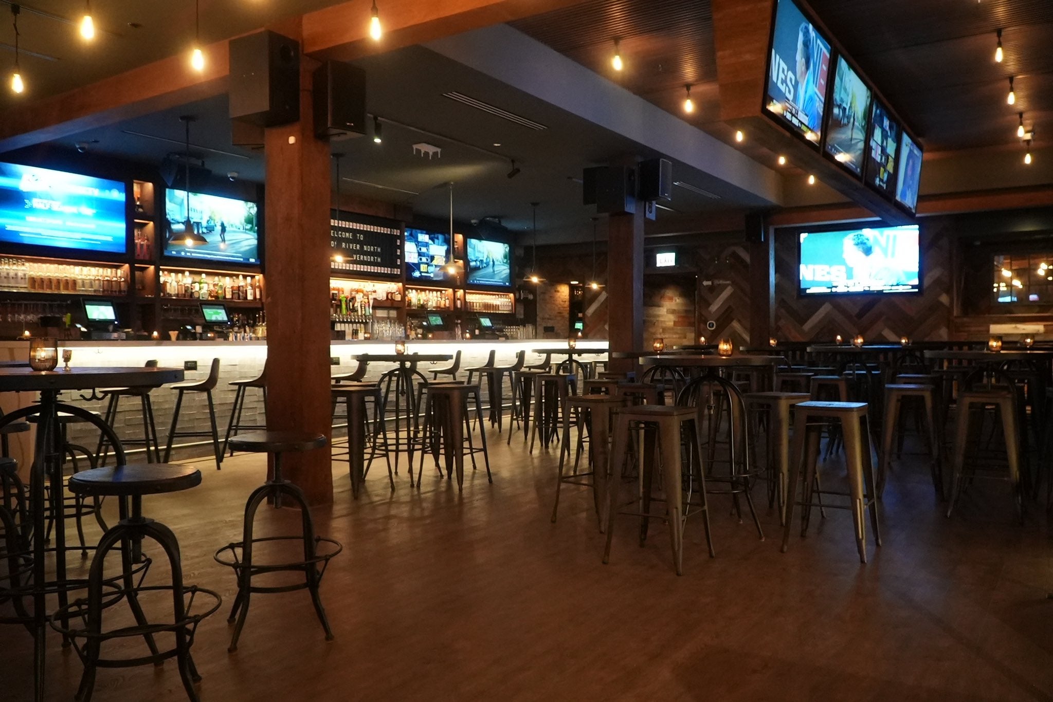 I know I'm biased but a day like yesterday is just a perfect reminder that the TV set up is top notch. The audio is pumping. So many sight lines you'd think we brought in a veteran Navy Seal sniper to map out the floor plan. Nothing better than having full panoramic views especially if you're like me and you like to change which TV you focus on to mix up good vibes. Like I try to find a good 3rd down TV for big stops. Obviously you have to change at half if you're losing your bet. Beautiful thing at Barstool River North you don't really have to move to watch a different TV. Just turn your head. We can't make it any easier for you guys.