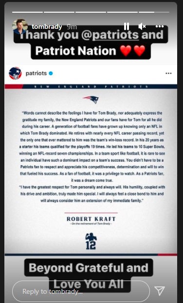 My personal friend RKK's heartfelt sentiment in statement was not lost on Brady himself, who now that he's retired gets to spend more time feeding his Instagram account. And so he responded. In the lamest way, laziest way imaginable. With a quote Tweet: