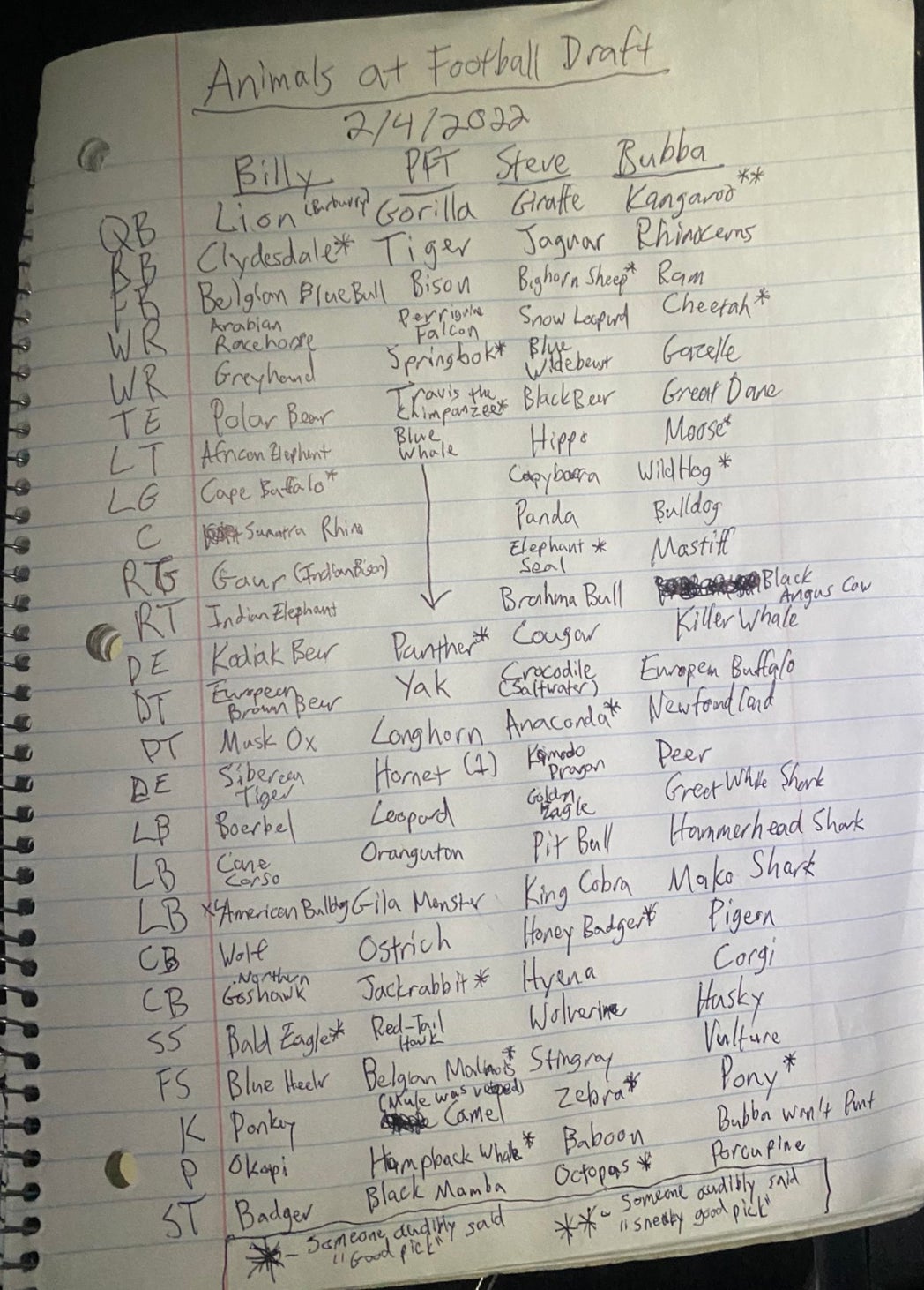 When your on a long road trip your mind wanders. When your on a long drive through Oklahoma your mind runs away from home and might never come back. During one particular hour long stretch on I-40, myself, Billy Football, Snapchat Steve, and Bubba decided to kill time conducting a draft of animals at various football positions.