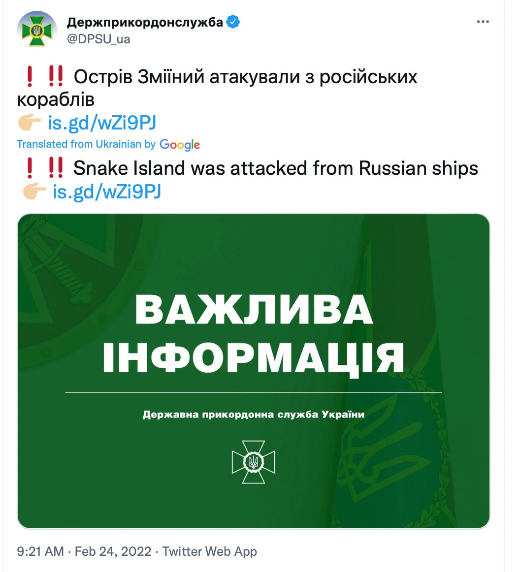 The official page for the State Border Guard Service of Ukraine confirms the island was attacked: