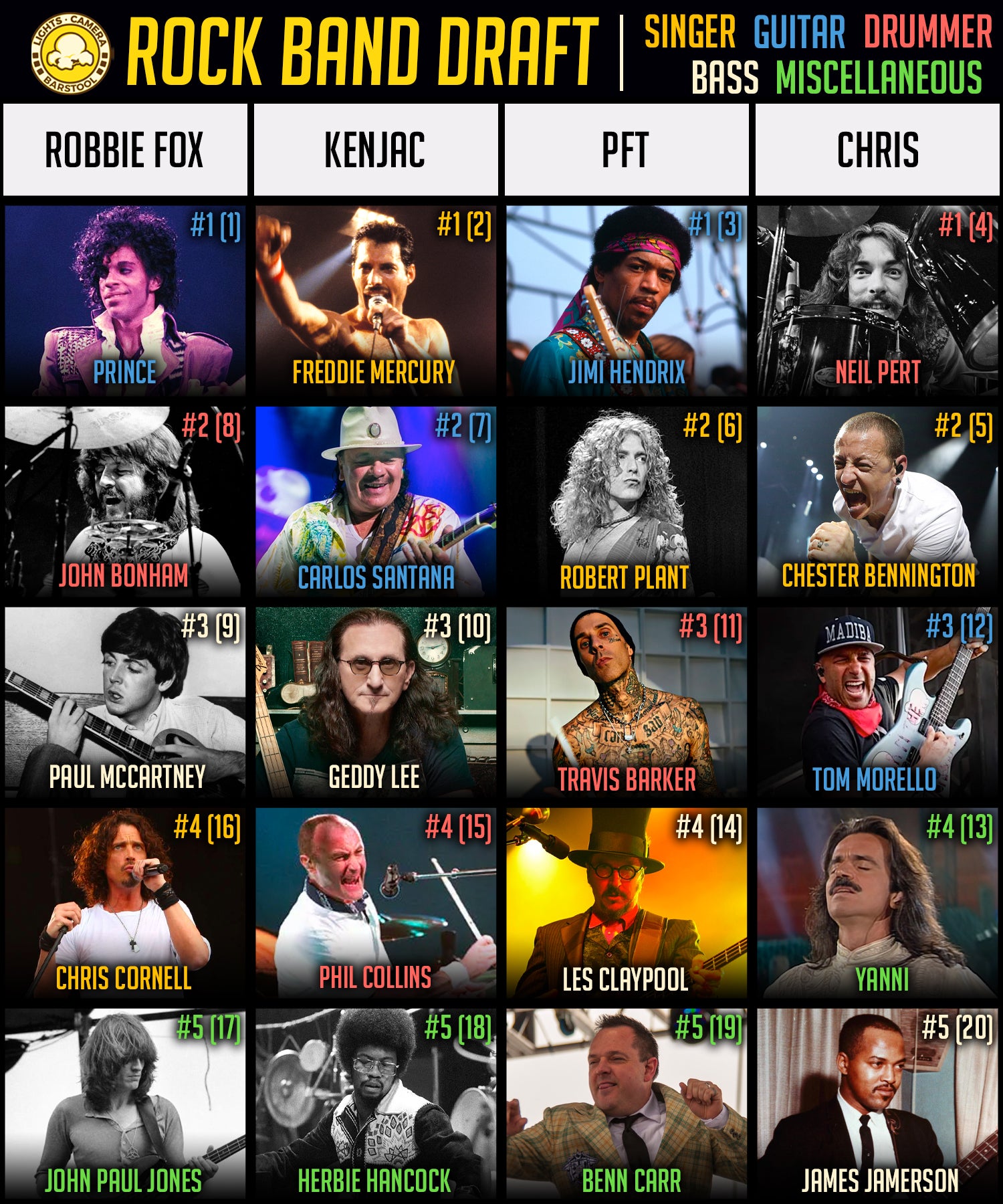 3. Bass: Geddy Lee is not only one of the greatest bass players ever, but he is a jack-of-all trades for my team. He can also provide backup vocals for Freddie and play the keyboard. He does all 3 at the same time regularly!