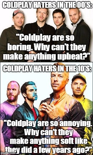 Is it bad, or lame, that I'm upset that Coldplay is evolving for no real reason? I think it is, and I know I sound like one of those miserable haters (who are the absolute worst). But I don't know. Maybe I'm fucking crazy?