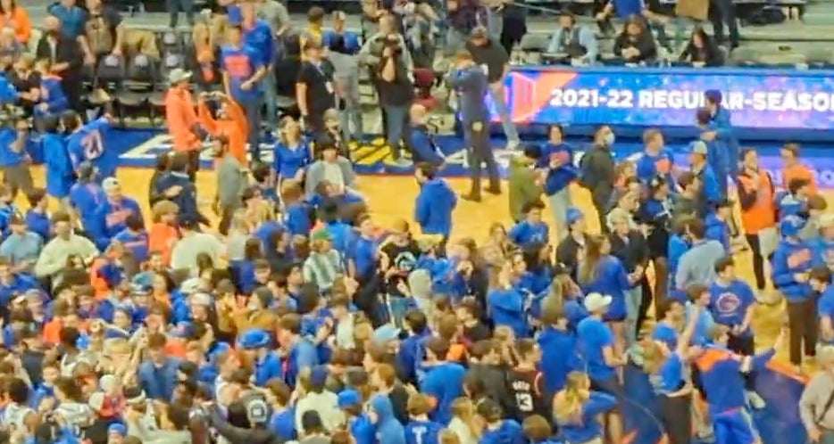 What the fuck is going on here? Boise State wins the Mountain West, a good ass conference, so people decide to storm the court. Good. That's how it's supposed to be. I say that because I think we may be a court storming company now. Might be all we do from here on out. Still waiting to hear back if that's the case. Except these hardo security guards either refuse to have fun or forget it's okay to storm courts. I'm pretty sure they forgot about half the arena or have no awareness because, this picture sums it up perfectly: