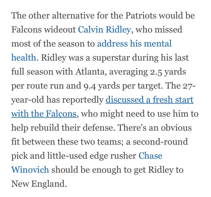The first name that's been trending on Patriots Twitter has been Calvin Ridley. Who, as has been suggested by some could be had for their first round pick. Which might make sense in that way they established the going rate on Brandin Cooks was a first, both when they traded the 32nd overall pick for him in 2017, and then flipped him to the Rams for the 23rd pick a year later. But Cooks was and is guaranteed 1,000 receiver. Ridley has had monster seasons, including 2020 when he had 1,374 yards, nine TDs and a 15.3 yards per catch average. Last year he only played five games due to unspecified personal issues: