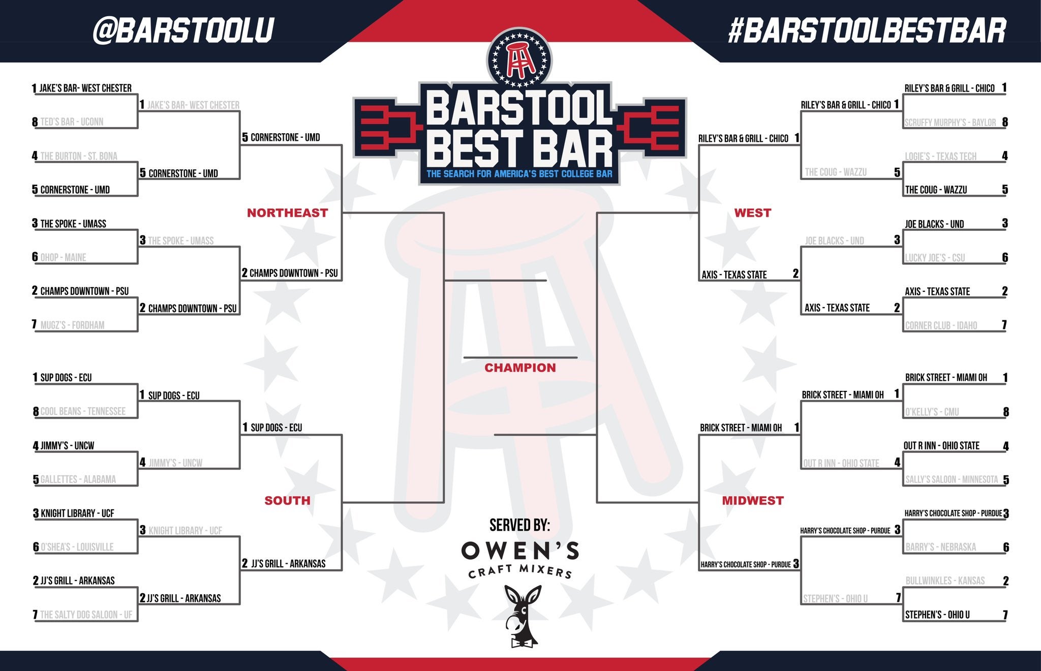 But I will say that Harry's Chocolate Shop is an awesome name for a bar. Although I'm sure Purdue students might be more focused on their basketball team being in Sweet 16, so we'll see how much time they have to vote for Harry's. Whereas if you're going to school in Miami of Ohio, you probably have nothing better to do. For that reason, I'm going with Brick Street moving on.