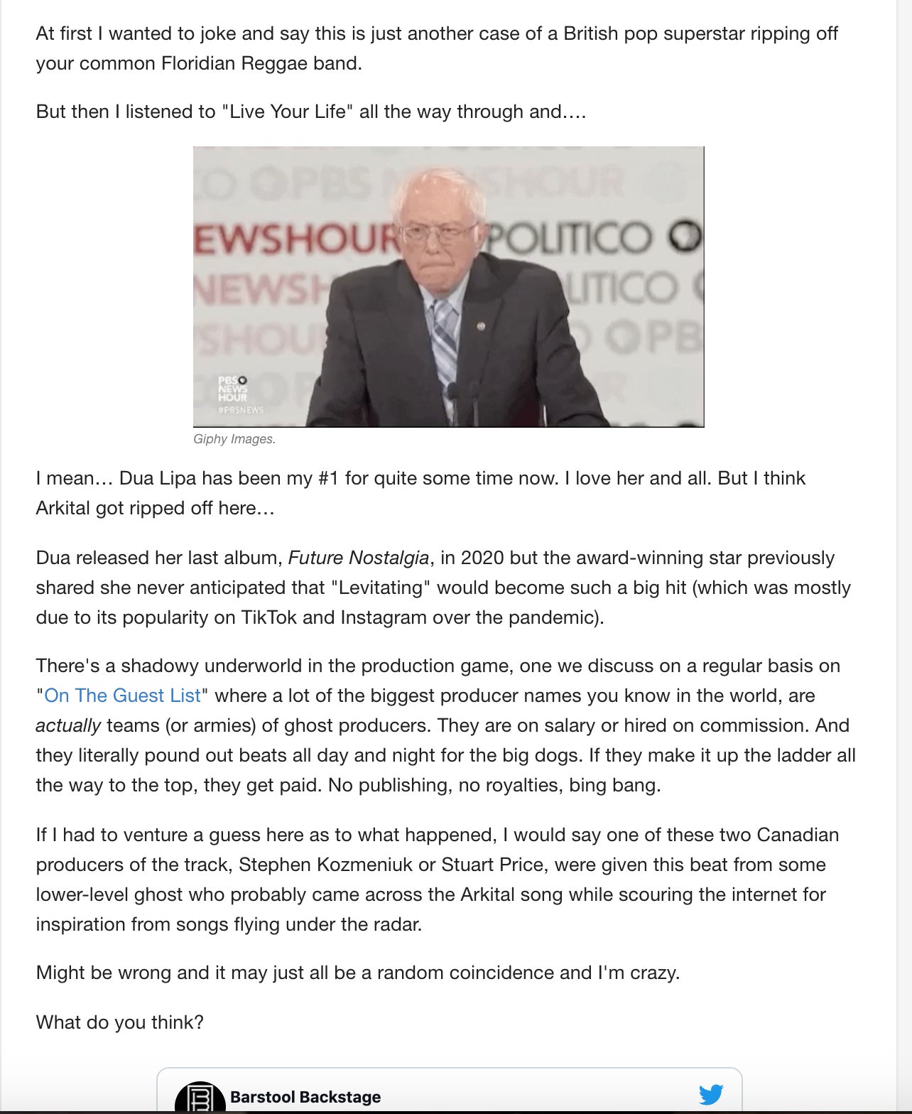 They fail to disclose the liberty they took using the other songs because they don't want to ruin the excitement and bada bing bada boom next thing you know Dua Lipa has a #1 on her hands and they're running it back to be remixed with Da Baby.