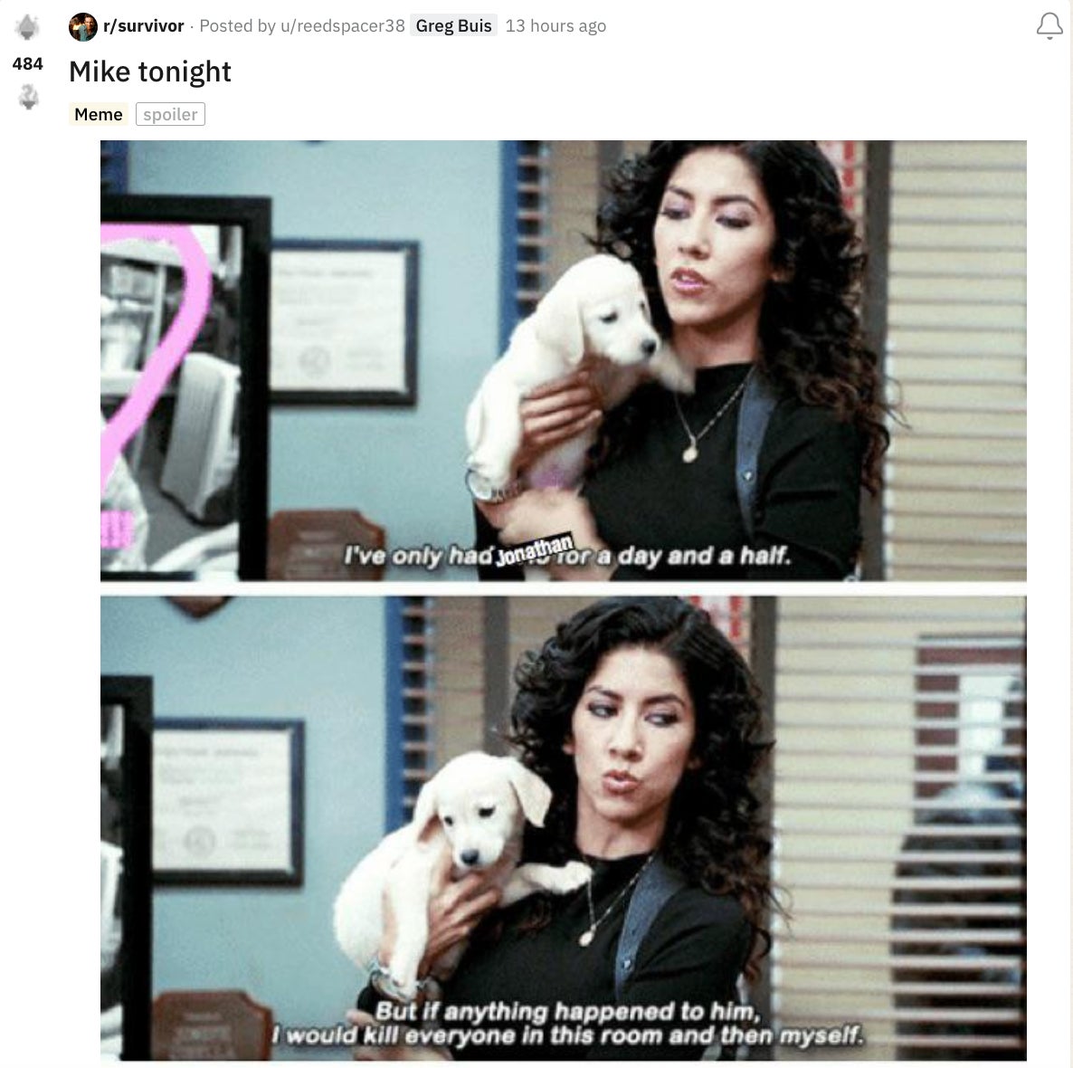 -I love this duo. They just bonded over how strong they both are. Jonathan said it's hard to overcome the stereotype that he's just a big, meathead jock and Mike said he was the same way when he was younger. I do think Jonathan is way more than that. He's a fully fleshed-out character. We've seen a LOT of Jonathan's personality. He's very well-rounded. His social game is great and he can be strategic too. The target on his back is just so huge, but he has a lot of winner characteristics and Mike is just an awesome social player. Everyone seems to like and trust him. I think he'll have to move up my winner rankings a bit. This meme from the Survivor Reddit page made me chuckle.