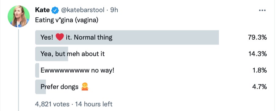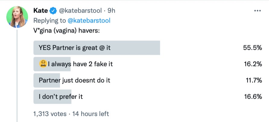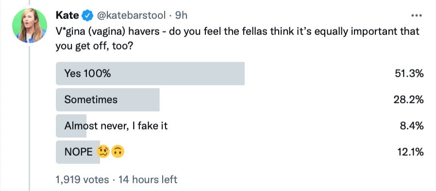 Given, I have a feeling some fellas voted on those last two (Uh, yes, my partner is very great at it!) and it's not exactly scientific, but as it stands I'd take the leap to say about half of the women polled are not getting satisfied, and from everything I've seen & heard from friends & social media I believe it's waaaay worse on a larger scale. For shaaaame!