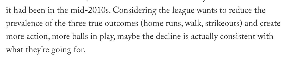 Yesterday we got this report from The Athletic detailing why: Manfred deadened the baseball AGAIN. The production issues in the past have been "resolved" and there is one universal ball in play, per MLB. Home run rates adjusted for weather are lower than any year during the juiced ball era.