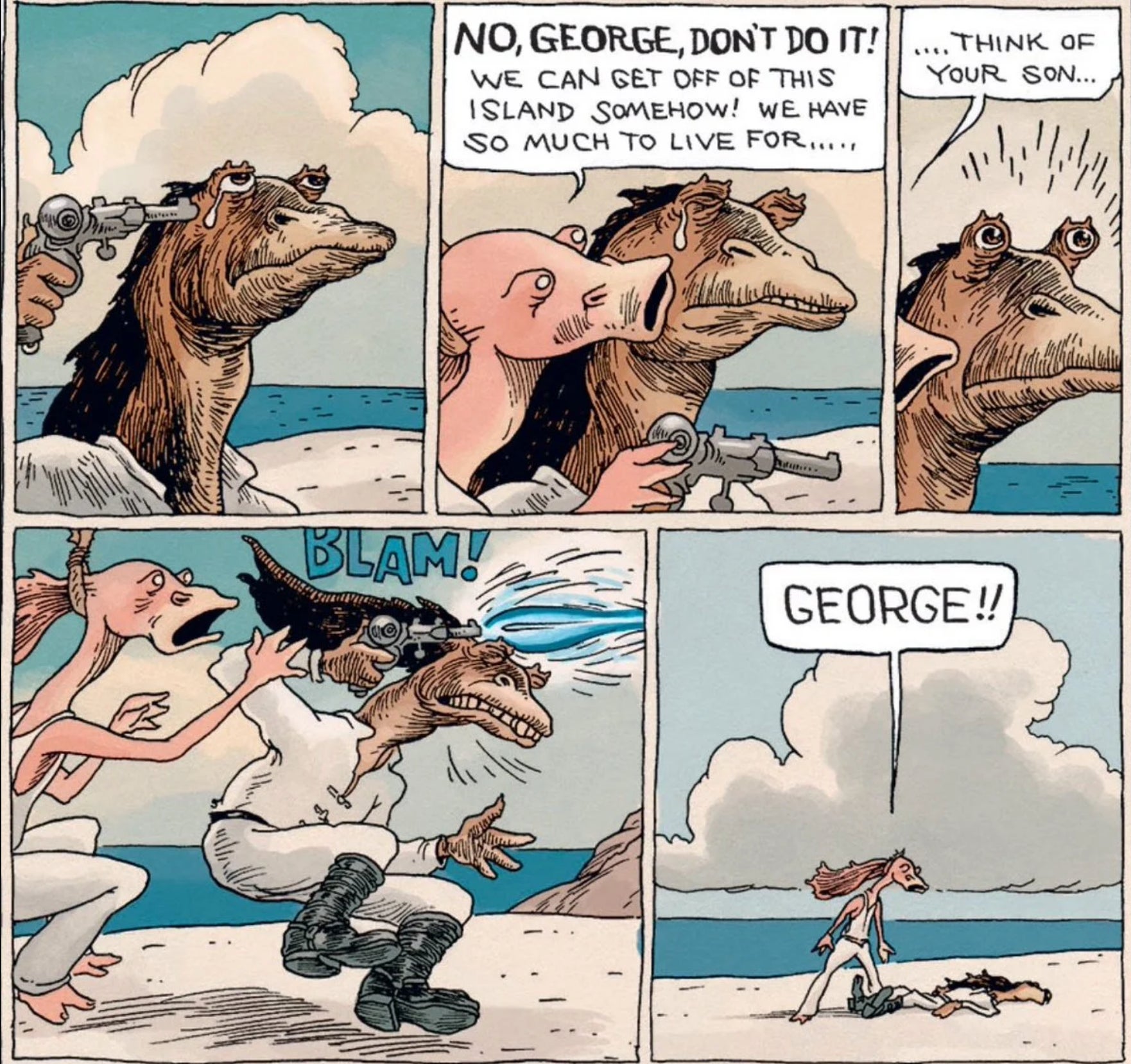That led us down a rabbit hole where Waldron told us about this insane page from an official Star Wars comic book where Jar Jar's dad (George R Binks) tries to kill himself but fails....
