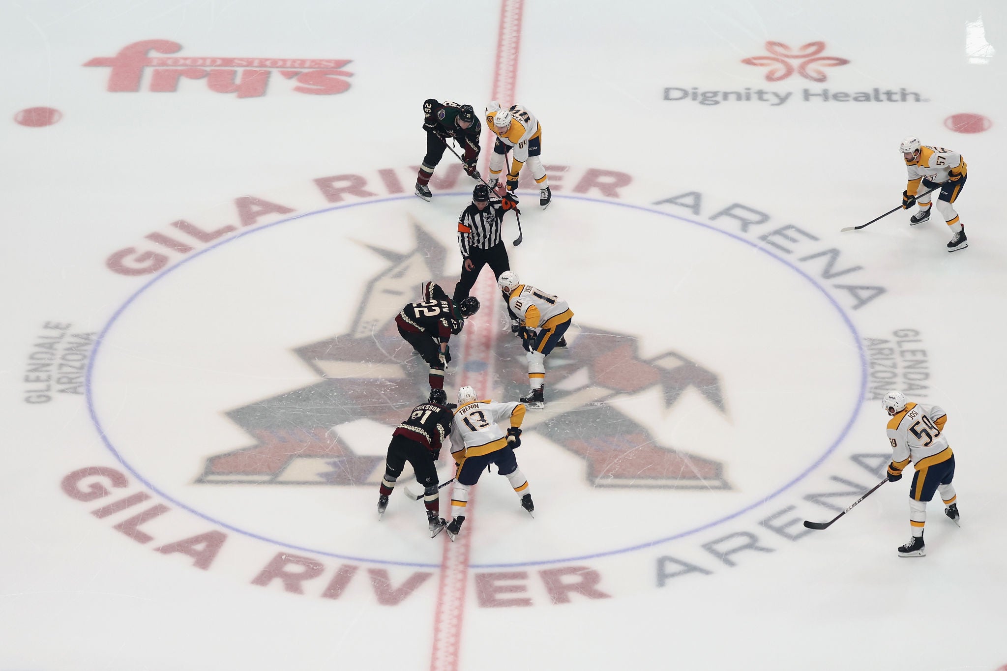 Christian Petersen. Getty Images.I'm sure by now that everybody knows the Arizona Coyotes have been kicked out of their in Glendale and will be playing their home games for the foreseeable future at Arizona State. The ASU Multi-Purpose Arena has a capacity of just 5,000. So the good news for the 'Yotes is maybe they can start to play in front of a sold out crowd. The bad news is every time they play at home, they'll be lining up for the first puck drop in the Sun Devils' logo. And the Coyotes can't even superimpose their on logo onto the ice during broadcasts.