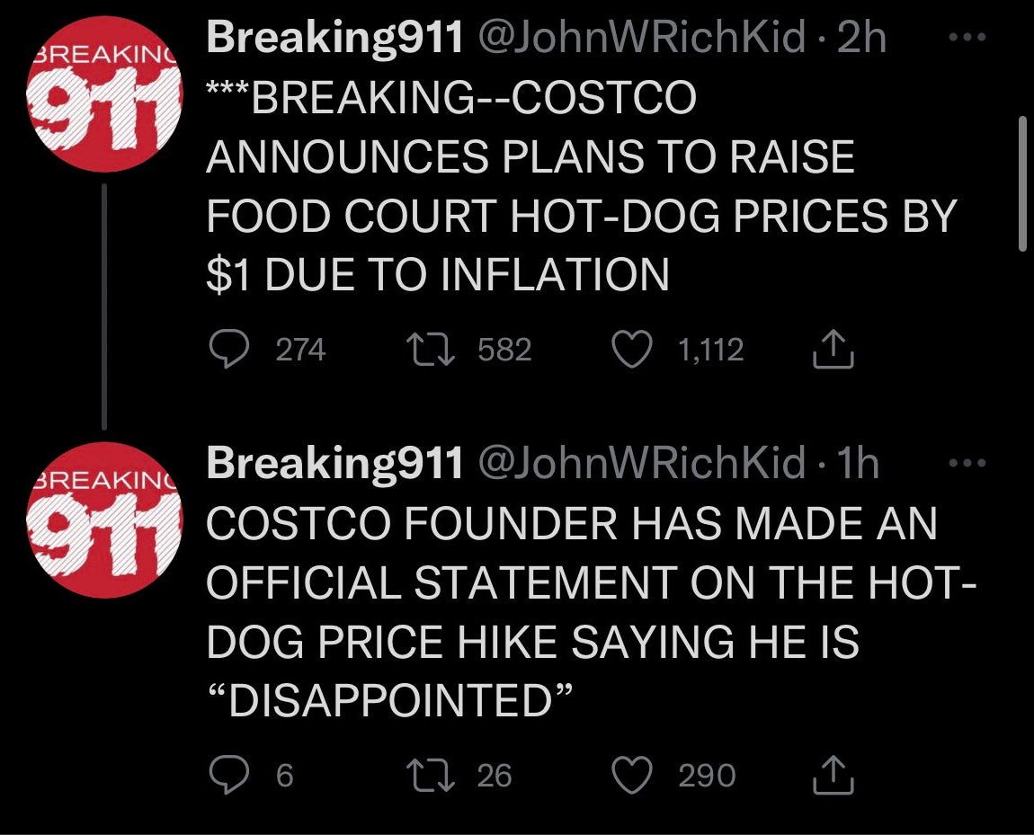 There are certain things you don't do as a joke because it will cause utter chaos. You don't yell "bomb" on an airplane. You don't yell "fire" in a crowded movie theater. And you don't yell "Costco is raising the price of their hot dog" on the internet. You also don't tweet stuff like this to amplify a rumor that can cause mass hysteria equal to dogs and cats living together.