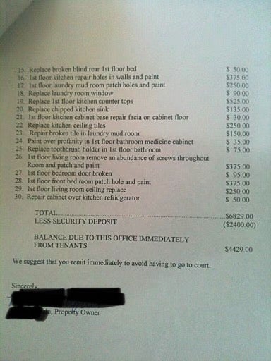 It's a funny story , and you'll all likely laugh about it. But in the end it's never worth it. First off , the landlords jack up prices of repairs (more on that later), and it's pretty shitty to make everyone lose their security deposit, or expect them to pay repairs when they didn't partake in the damage, even worse if they weren't there at the time.