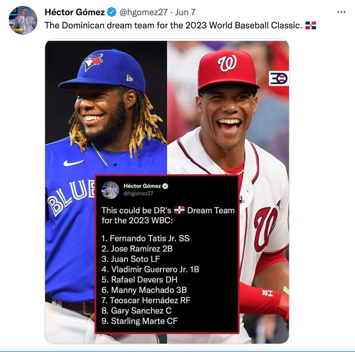 Nothing gets me more fired up than World Baseball Classic potential rosters, this one specifically. Hector Gomez tweeted out a projected roster and lineup for the Dominican Republic's potential 2023 WBC team and it is a sexual list. Quite literally an All Star team. A modern day Murderers Row lineup. For my money, the WBC is one of the cooler events in sports, has some Olympic vibes with the country representation, we get the stars out there, we get some awesome games, and the tournament somehow always delivers. The cream always rises to the top in these kind of events. Plus it makes it fun when these guys actually want to play, which they do. It's not like the Pro Bowl or something when we're scrapping the bottom of the barrel for guys to come out, these guys legit want to compete and represent for their country.