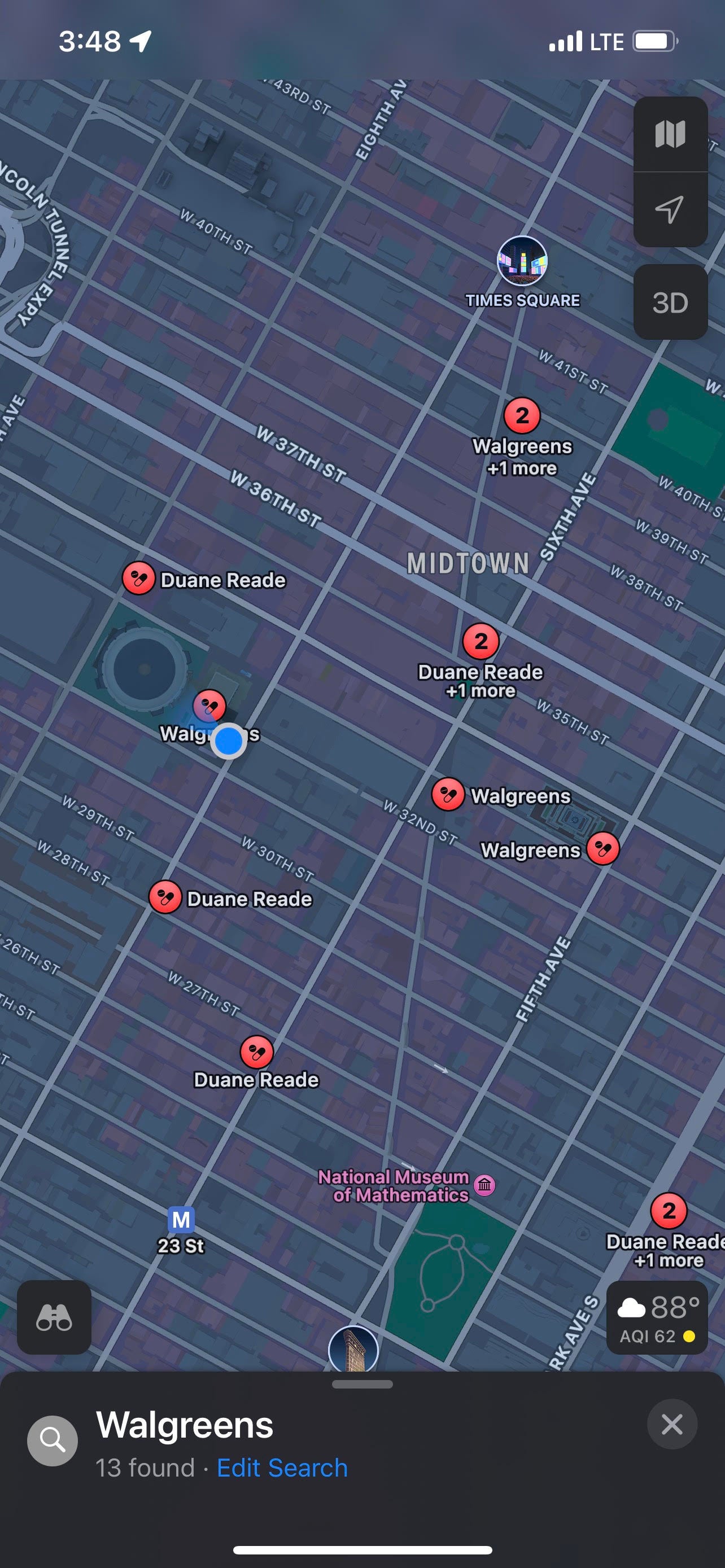 I decided that I would go to Walgreens first. There is a "Duane Reade by Walgreens" right next to the office, but I wanted to find one that was just a Walgreens. So, I pulled up a map and typed in Walgreens. My map told me that there were a couple of them nearby.