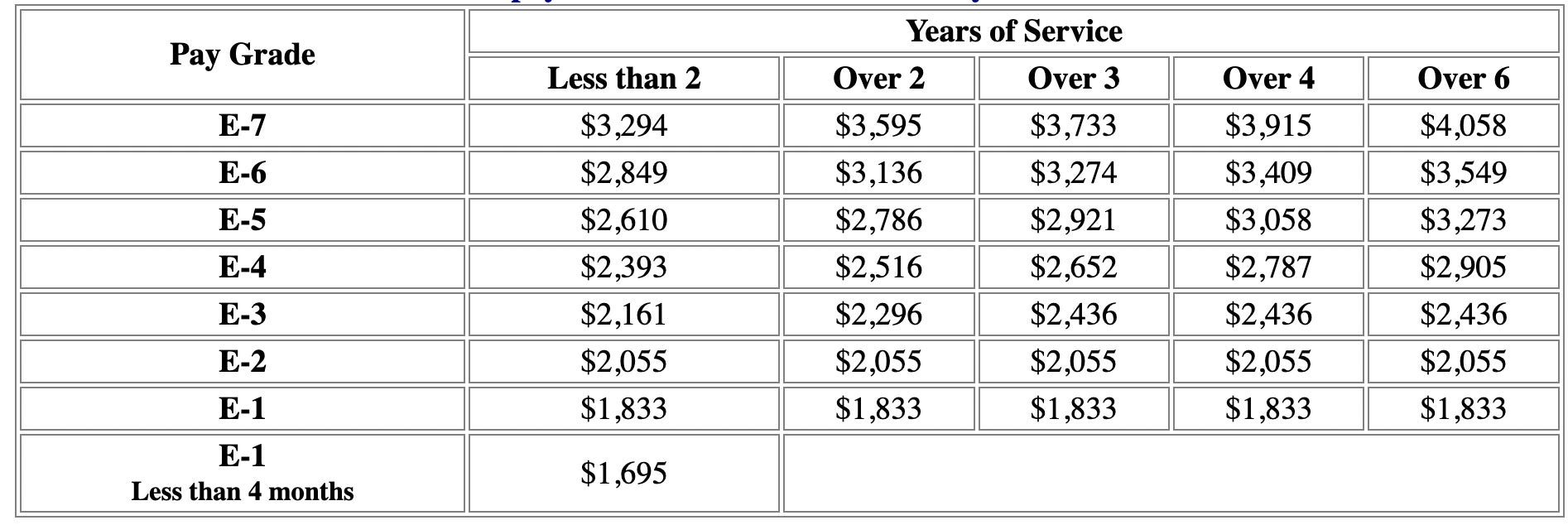 So, all the way down at the bottom you see the starting pay. You're in boot camp and shit like that the first few months. You're getting 1700 dollars before taxes for that. After your first four months (or when boot camp is over for everyone), you're getting 1800 bucks a month. You're also getting medical, dental, housing, and sometimes food. But, unless you're a bag of shit, you'll like be at least an E-3 or possibly an E-4. If that happens, you're all the way up to maybe 2,500 a month. Not bad, right? It's kinda bad.