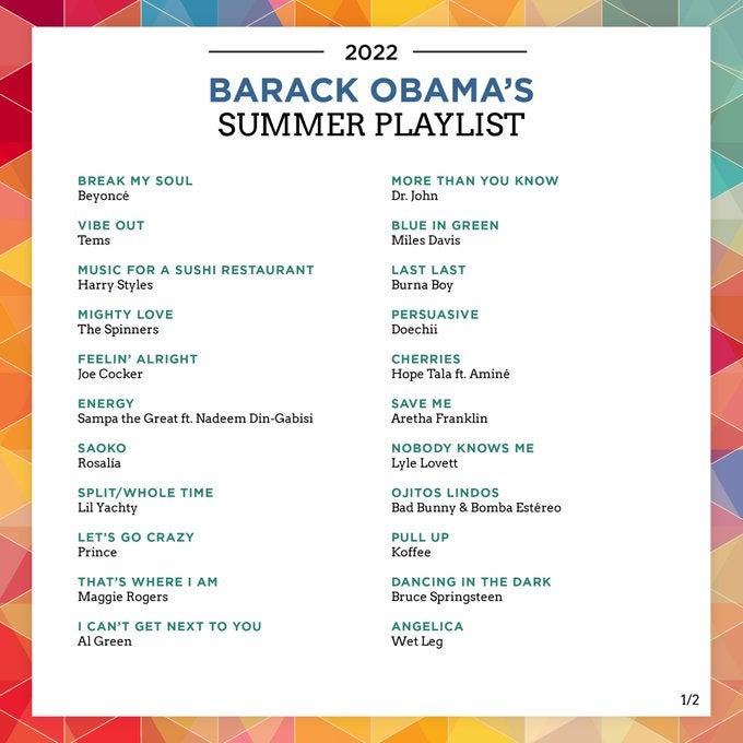 His summer music playlist consists of 44 songs, some from current popular artists, including Drake and Rihanna’s “Too Good,” Tems’s “Vibe Out,” Beyoncé’s “Break My Soul,” Koffee’s “Pull Up,” Burna Boy’s “Last Last,” Kacey Musgraves’s “Keep Looking Up,” and Vince Staples and Mustard’s “Magic.”