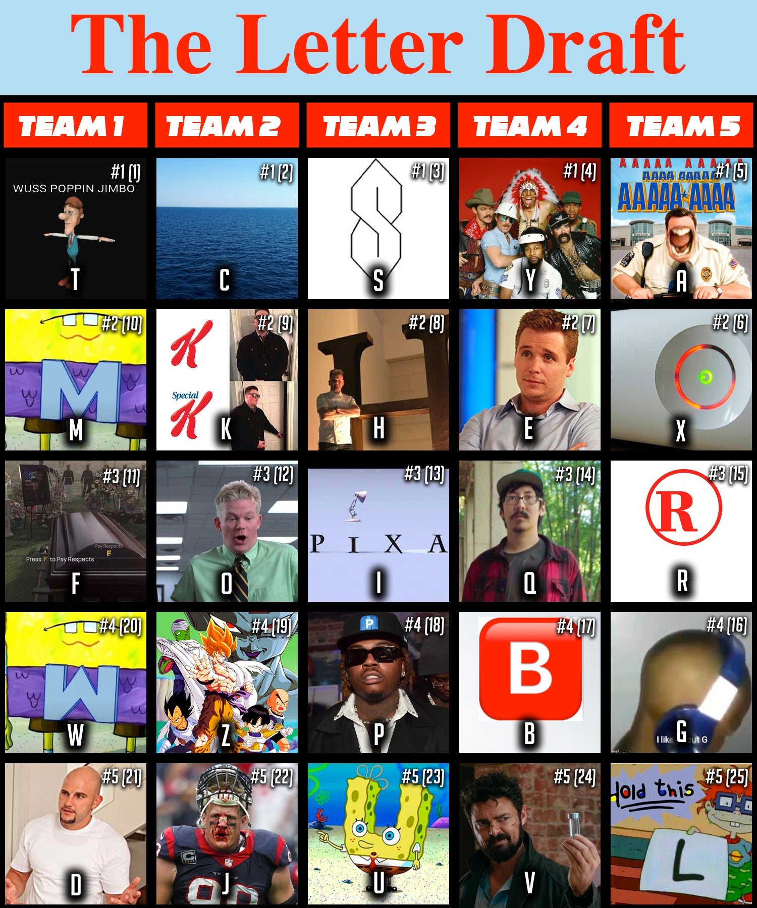 This combination of letters has never been next to each other. Ever. Not on a license plate. Not on an eye test chart. Not on an encrypted password. Never. Simply amazing. Y in round 1 I'm not a fan of, but E in Round 2 is good value. Q is a WILD pick in Round 3 and could have gone undrafted. I'm glad this was called out in real time by the other drafters. The fact he didn't get a U was classic. B I don't mind as it's a rounder version of E. V in the last round is good value as it represents female's privates which are great things, no matter what Glenny tries to tell you. Someone had to be left off the poll and this was the obvious choice.