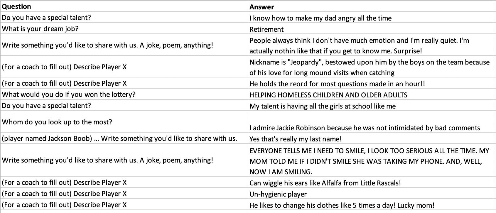 Off the top, you have to respect the self-awareness that this kid makes his dad angry all the time. A dream job of retirement is a fantastic response, too. He understands the importance of #SomeThings by his lottery answer, and man does he know how to get the ladies to love him. His name is Jackson Boob?! My goodness. The only downside here is that he changes his clothes five times a day. That's insane.