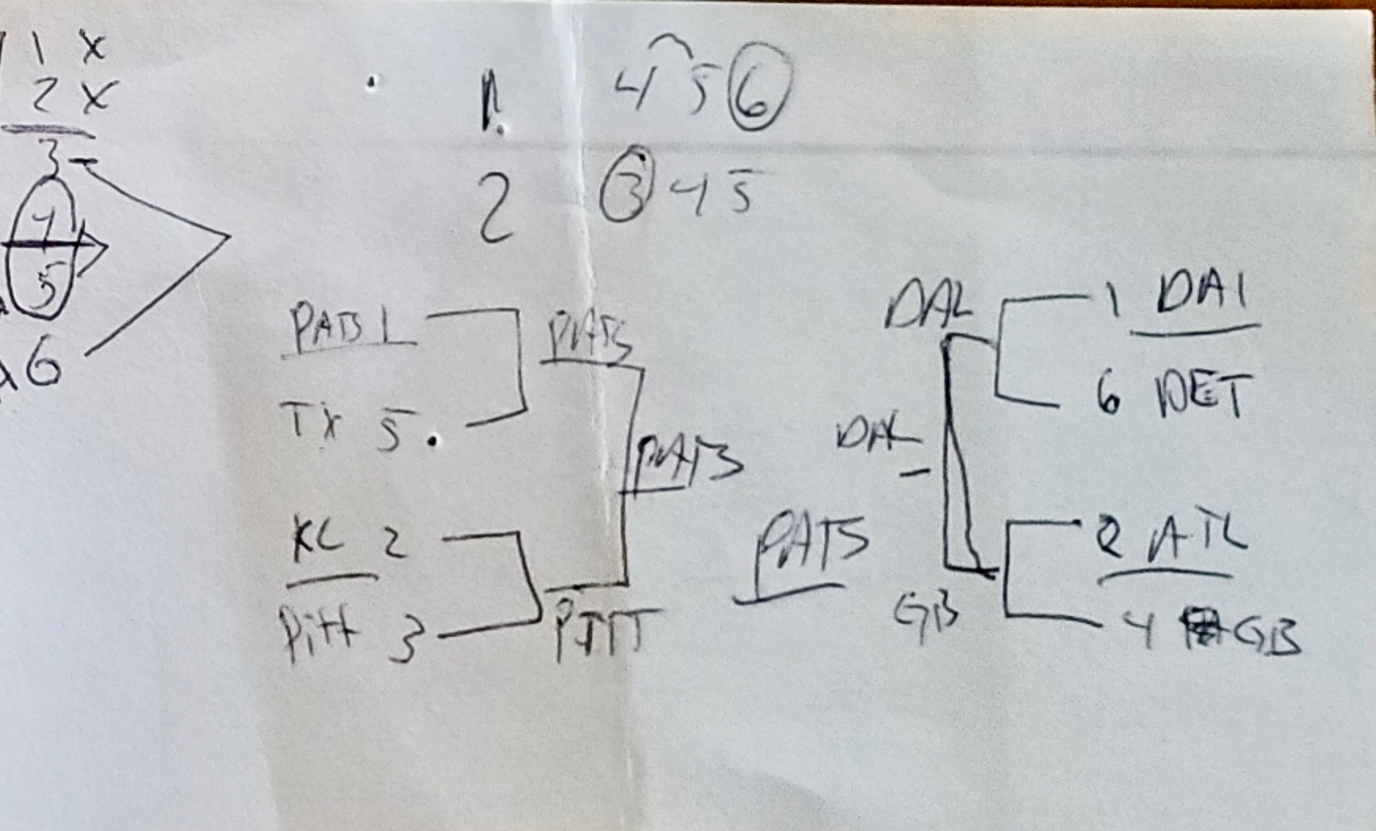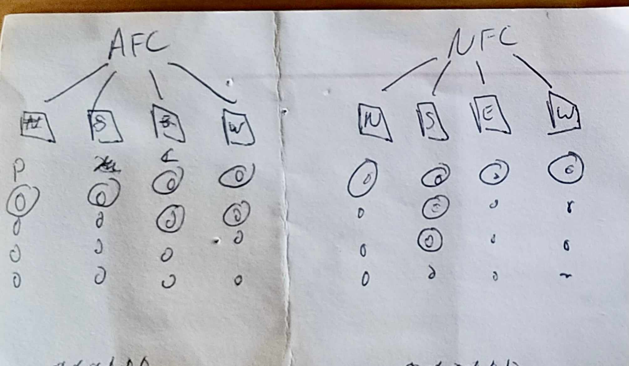 In honor of Kayce and football season at Barstool Sports, I decided it would be an excellent time to get back into gridiron University. When my son was in high school, he played quarterback. I didn't know much about football, so my friends would sit by me and fill me in on all the gridiron happenings so I could cheer at the correct time. I think I embarrassed a few of them when I would cheer for the other team's good call. Later, Michael, my son, tried teaching me how the NFL playoffs work by drawing this diagram for me. It worked!