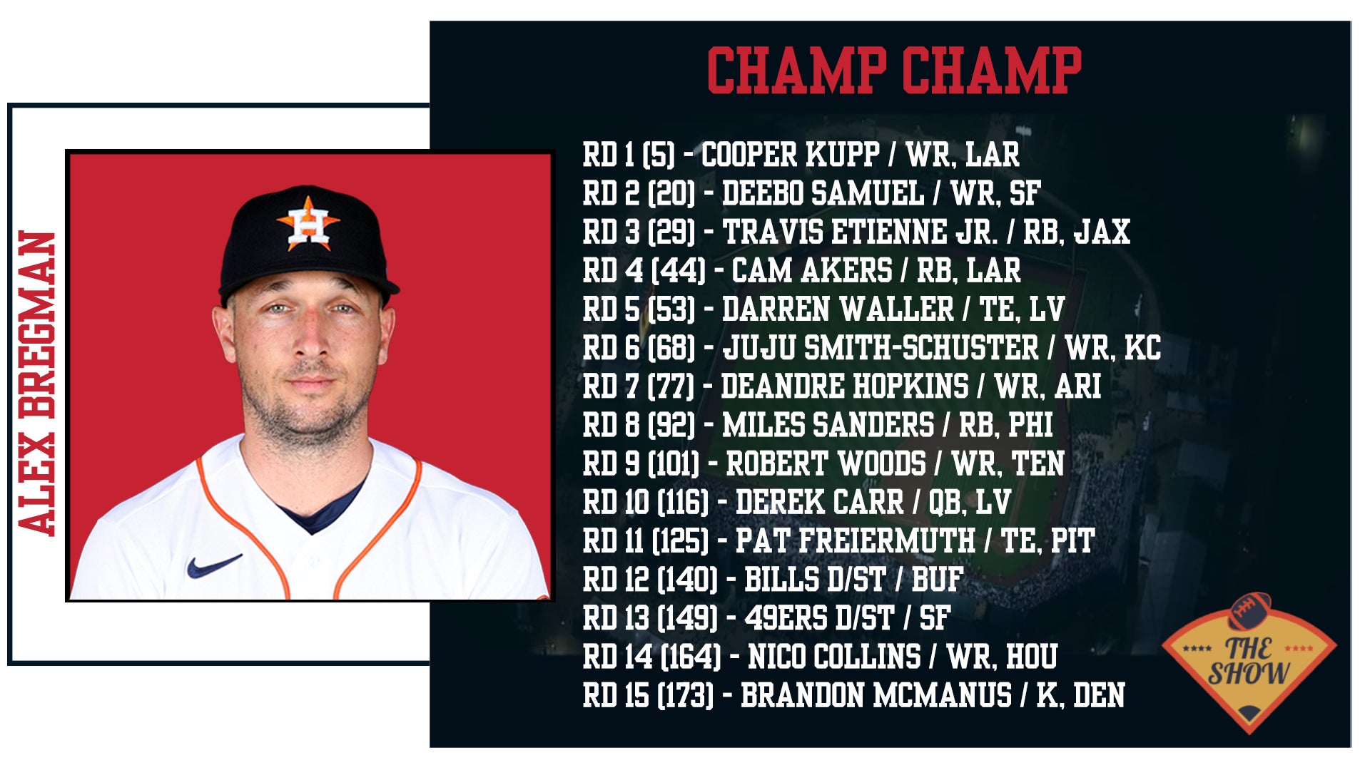 The defending champ, Alex Bregman who drafted four Runningbacks in a row to kick off his 2021 Draft went with the value play and got Cooper Kupp 5th overall in a PPR league! The guy caught 145 balls last year! Bookending that with Deebo Samuel was a nice move at #20 overall. I love his Receiving corps and it should be the best in the league. Along with Kupp and Deebo, he's got JuJu Smith-Schuster who has a ton of upside in KC, Robert Woods who has always been solid, Nico Collins with big upside in Houston, and DeAndre Hopkins which was a shrewd play. This roster is good enough to tread water for 6 weeks. After he serves his suspension, he'll be trotting out three legit WR1 with Kupp, Deebo, and Hopkins. That is scary. Travis Etienne is an unknown having missed his entire rookie year, but he's got great hands and good be a really force in PPR. Cam Akers looked rough coming off his injury last year, but he's so young will he rebound? Drafting two defenses is actually a strategy I can get behind, especially because the 49ers play the Bears Week 1. Good foresight there. But this team will depend on the QB/TE stack of Derek Carr and Darren Waller. This team is so talented I'd almost rather diversify, but if those two are clicking, this team may be unbeatable.