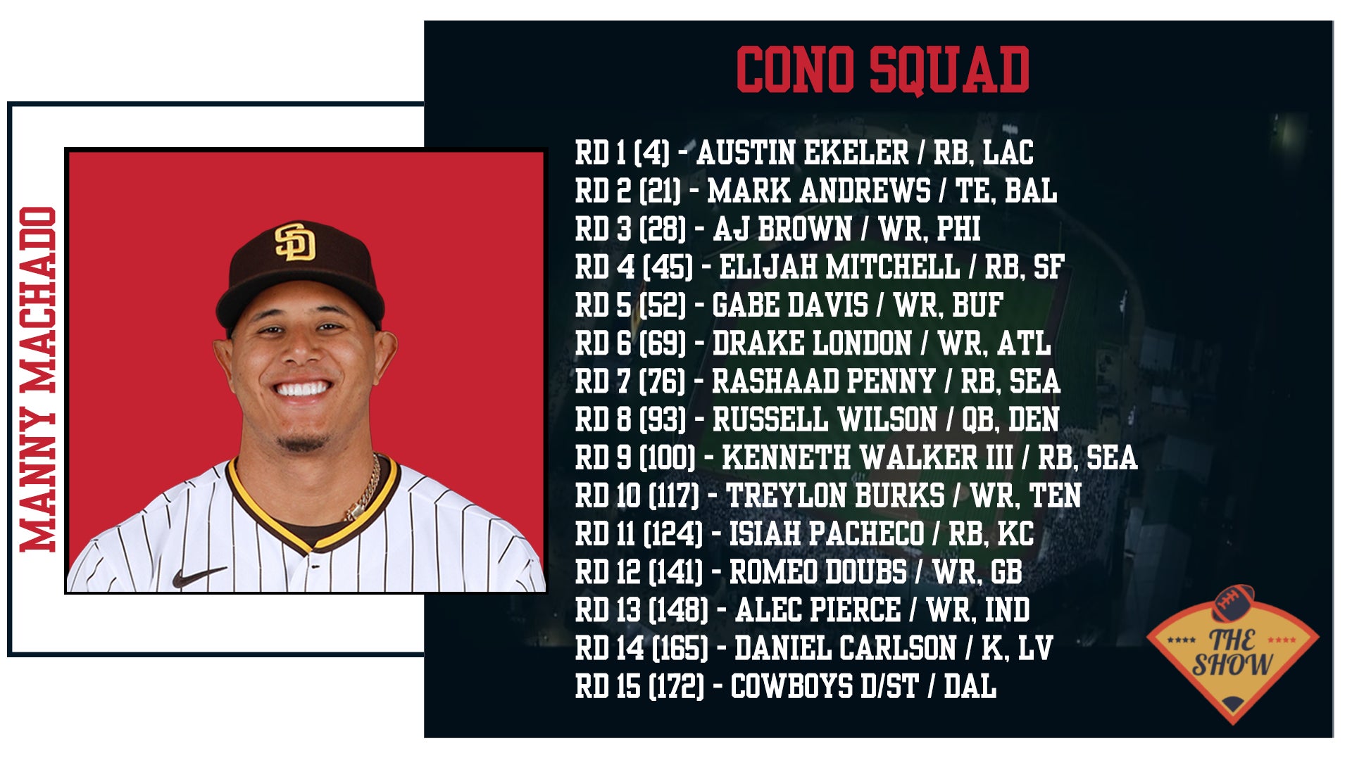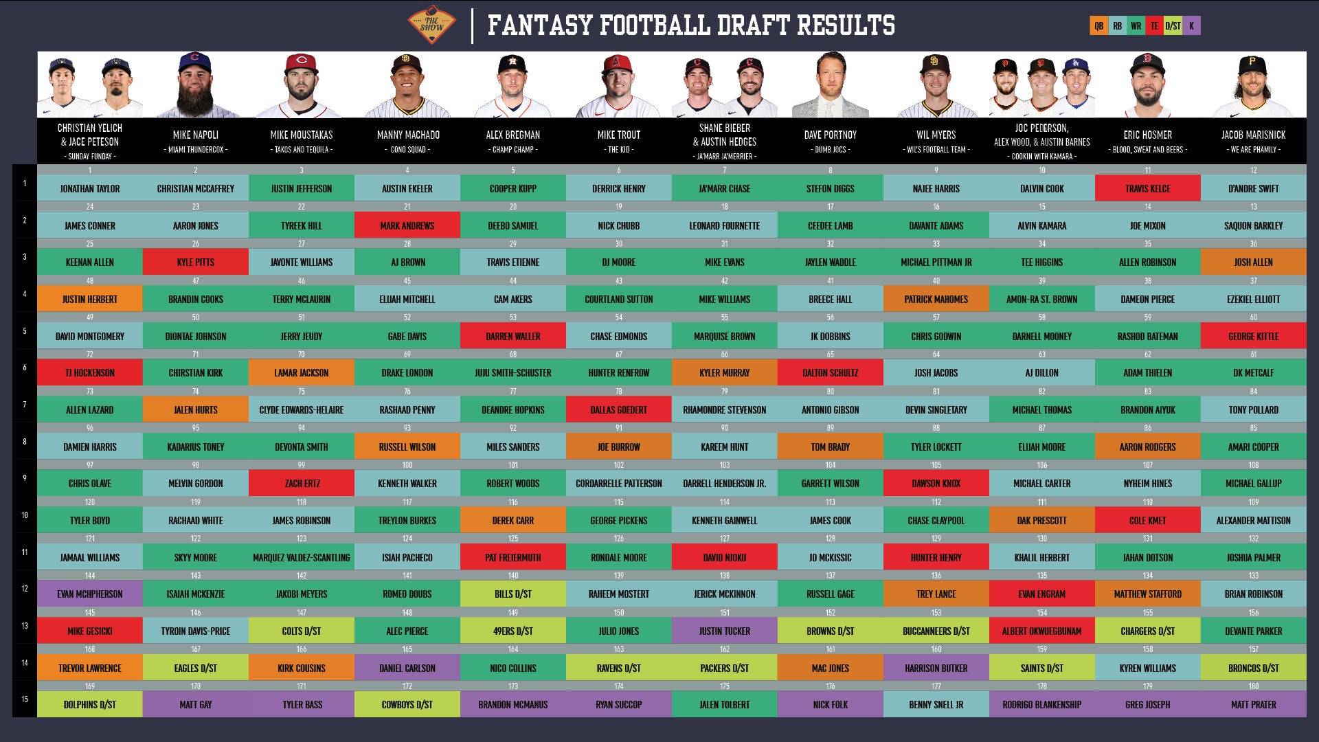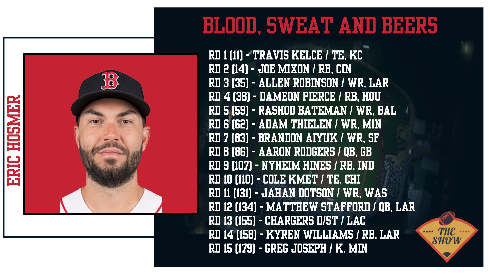 Eric Hosmer brought some fantasy magazines, cheat sheets, and a sharpie to the Draft. Love to see that type of preparation and attention to detail. It clearly paid off as he went Travis Kelce at 11th overall, which based on a PPR scoring format, gives him a monster leg up on the rest of the league at that position. The value was great and that's my best 1st round pick for the value. Joe Mixon in Round 2 is a good value. I'm less high on him, but I understand that he just turned 26 and they improved their Offensive Line. He should also be the bellcow in a good offense, so a very high ceiling. Allen Robinson is sneaky pick as he's finally with a good QB and has the potential to put up numbers. The only concern there is he was just so bad last year, but again, different situation. Dameon Pierce is a savvy play for RB2 38th overall. Breece Hall went right after and then that position takes a big step back, so good move getting an RB2 there. Rashod Bateman is in a potential breakout spot with Hollywood Brown leaving. Mark Andrews will get a ton of targets but they will have a WR out there and there are now 146 vacated targets. Adam Thielen has been productive when on the field and I almost wonder if he'll be the guy to see the biggest bump with Kevin O'Connell coming over from the Rams. He profiles the most similarly in size/speed/body type to Cooper Kupp, so I have my eye on Thielen this year. Brandon Aiyuk had a disappointing year last year, but historically, Year 3 is typically when most WRs put it together. Jahan Dotson is also a good flier later in the Draft as reports out of Washington is that he actually has the best chemistry with Carson Wentz so far. Cole Kmet is a solid option at TE and should get a lot of work with a young QB in Chicago. But my favorite part about this draft was bookending the QB position. Aaron Rodgers and Matthew Stafford should both be 30+ TD guys and in a 6-point passing TD league, that is super valuable. To get Rodgers in Round 8 and take Stafford in the 12th is great value and will allow him to rotate them based on matchup. This gives Hosmer a huge leg up on a week to week basis against his opponent as the waiver wire simply is not as favorable.