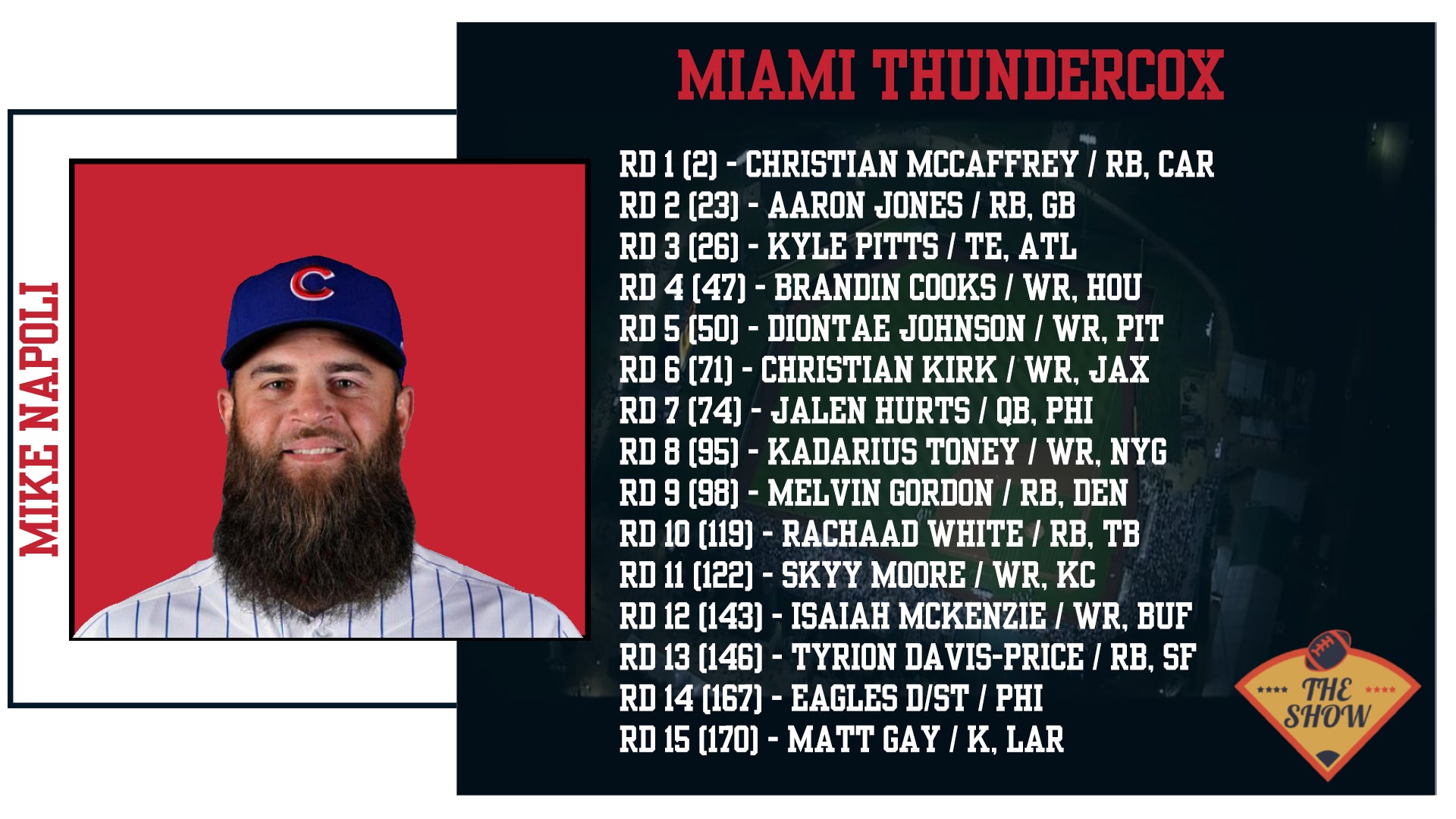 In my ESPN Fantasy induced haze when I couldn't see anything, I asked who had the best team and there was a lot of praise for Nap's early round. He seems like a great dude, but I do not agree. Christian McCaffrey is such a risky play at #2 overall. I understand his outstanding upside, especially in a PPR format, but the guy has played 10 games in 2 years, so I cannot get on board with him early. Aaron Jones is another one, while I like him a player, he's 27 years old and was ceding carries to AJ Dillon towards the end of the year. I realize he can also catch the ball, which is especially valuable, but I feel like his best days are behind him. Kyle Pitts has a ton of upside, but the guy scored 1 TD last year and his Quarterback just got worse. He'll need to get in the paint at least 8 times for that pick to be worth it at #26 overall. I don't mind the next three picks with Brandin Cooks, Diontae Johnson, and Christian Kirk filling out his Receiver room, but the rest of the draft isn't my favorite. Jalen Hurts is a tough play in a 6 point passing TD league. Especially with 30+ TD guys like Tom Brady, Aaron Rodgers, Joe Burrow and Russell Wilson going the round after. Kadarius Tony has some good upside and he's dynamite when he's on the field. The rest of the draft I respect the lottery tickets. If Rachaad White, Skyy More, Isaiah McKenzie, or Tyrion Davis-Price turn out to be a dude early, that could certainly help his outlook, but I wasn't an overall fan of the final product here.