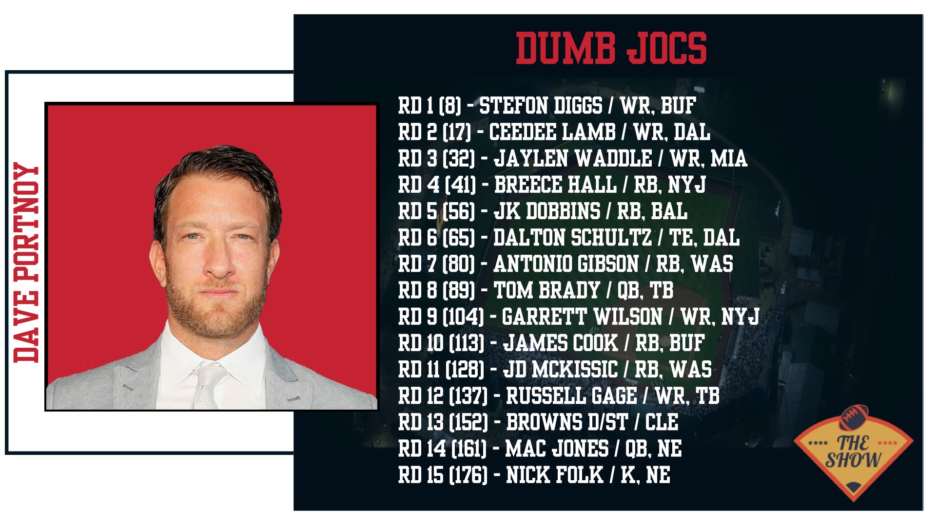 Dave going Zero RB early?! You love to see it! While there were some disconnects on what to expect and the ESPN Fantasy site totally boned me, Dave recovered quite well. Stefon Diggs and CeeDee Lamb are my WR4 and WR5, so I love the value of those picks. Lamb is a steal at #17 overall and Diggs is undervalued. He did have fewer yards last year than his dynamite 2020 campaign, but he still saw 164 targets and scored 10 TDs. It wouldn't be surprising for him to get back in the 1,500 yard range and score double digit TDs. In PPR especially he's dynamite averaging 115 catches/year with Buffalo. Despite his 104 catch campaign last year, I'm not as high on Jaylen Waddle here. They brought in Tyreek Hill, so that should take away from some of his target share. But based on the board at that time, it's fair value. Mike Evans going one spot before was a bad beat. I do LOVE the Breece Hall pick in Round 4. He's got big time upside in that Shanahan style scheme. JK Dobbins wouldn't have been my pick in Round 5. He was dominant as a Rookie averaging a staggering 6.0 YPC, but missed all of last season with an injury. Baltimore runs it a ton, but typically by committee, will Dobbins be the bellcow? If he is, that's a win, but his lack of receiving ability could hurt in PPR. I like Dalton Schultz, he's my TE4, but 6th round is too rich for me. I would've sat til late. On the plus side, with Michael Gallup limted to start the year, Dave will own most of Dak Prescott's receiving yards with Lamb and Schultz. Antonio Gibson is a savvy play in Round 7 after the unfortunate Brian Robinson news. I also like him nabbing JD McKissic late to handcuff that backfield situation for now. McKissic is also a sneaky RB2 play if you need in PPR. Tom Brady is Round 8 while maybe seeming like a homer play is actually a terrific pick in a 6-point passing TD league. Brady is my QB3 and led all QBs in TD passes last year with 43. The rest of his bench has some upside with Garrett Wilson seemingly being the easiest college WR to transition to the NFL, James Cook having good receiving ability and coming into a weak Buffalo backfield, and Russell Gage getting to work the slot with Tom Brady. The Browns also have a sneaky easy schedule the first four weeks so I like that pick. The Mac Jones pick is classic Dave and now we've got a Brady/Mac Jones QB room for the first time ever. Looking forward to see how it plays out!