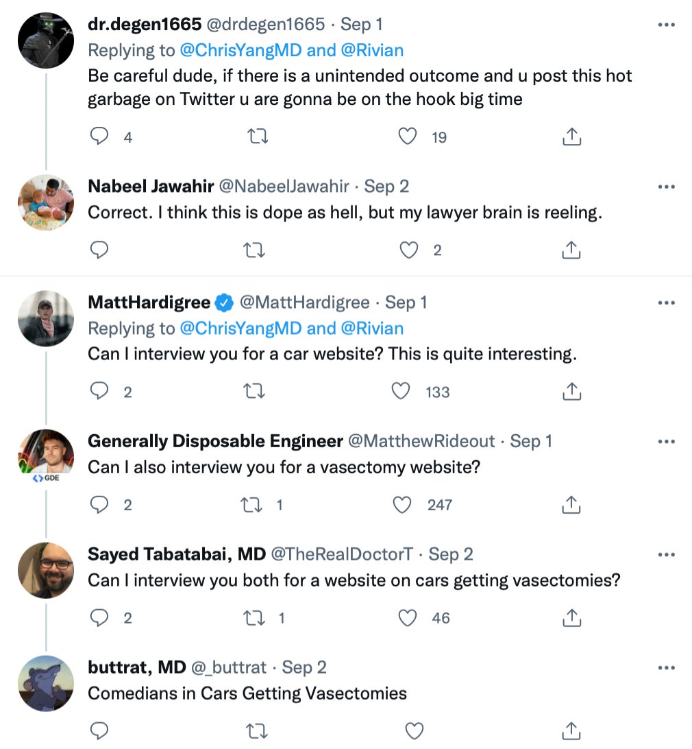 Hand up, I'd never heard of Rivian Electric Trucks until I saw this one helping snip some dude's balls. They've only been produced for one year so far, start at $73K and can go about 220 miles when loaded up on the highway. No word on how many vasectomies it can power, but if I had to guess I'd say this thing could help blast at least 200 vas deferens to smithereens before a recharge.