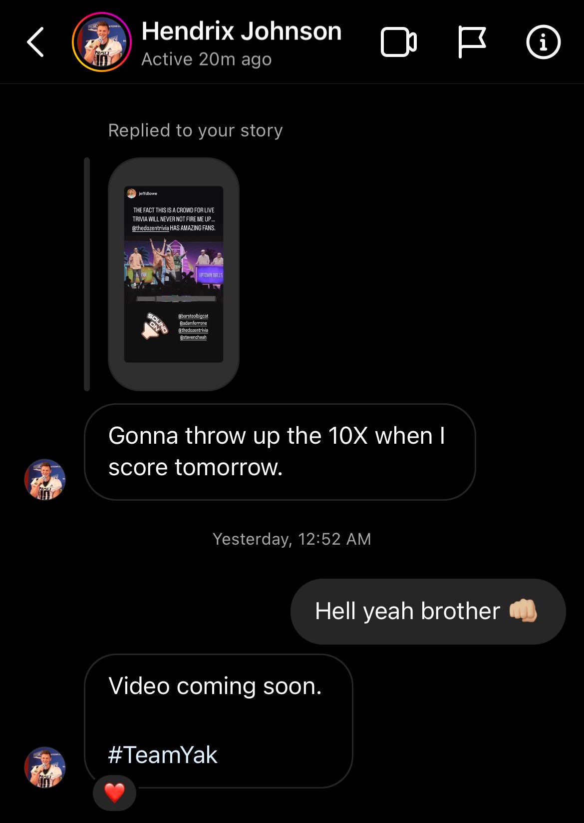 Hendrix Johnson is a Wide Receiver at Northern Arizona University. I've never met him, but I posted a story on Instagram the other day about The Dozen's event in Philadelphia and got a DM from him. He said he was a Yak fan and he was going to do a 10X TD celebration in his game the next day.