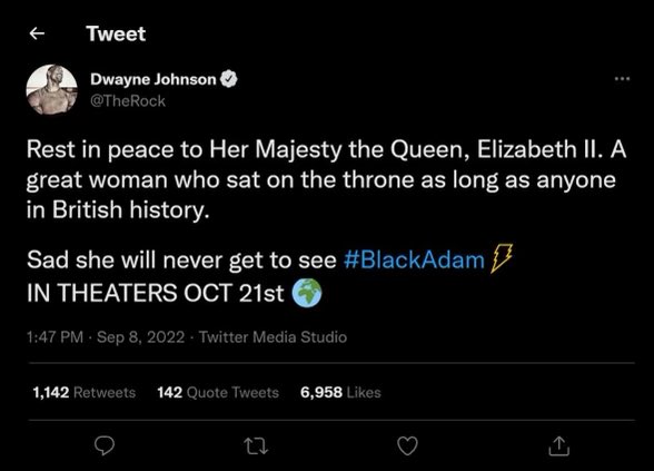 Small backstory: when the Queen died there were a ton of fake tweets and memes going around. I turned to my co-host on Lights Camera Barstool, KenJac, and said, "what would The Rock say if he tweeted about the Queen?" Naturally, in a hyperbolized world, we figured he may sneak a plug in the tweet for 'Black Adam', his upcoming movie that he's been promoting nonstop for what feels like 10 years. So, we ended up with this...