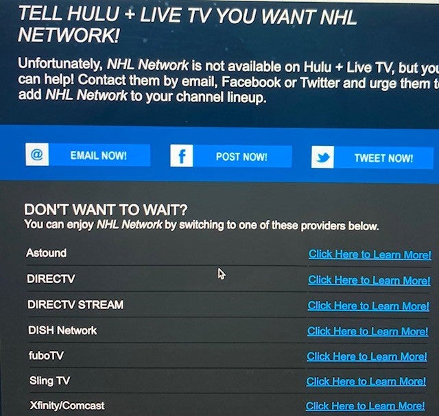 Are you shitting me? We have Crosby vs. McDavid in primetime but American fans can only (legally) watch it on a channel that many people don't even have, the NHL Network (except for Pittsburgh-area market). So one year after essentially putting the entire season online so fans can stream the games, those same NHL fans couldn't watch a marquee game because it was airing on a channel you can only get from a cable/satellite/onlineTV provider and not the services (Hulu, ESPN+, Disney+) you signed up for last year…to watch fucking NHL games.