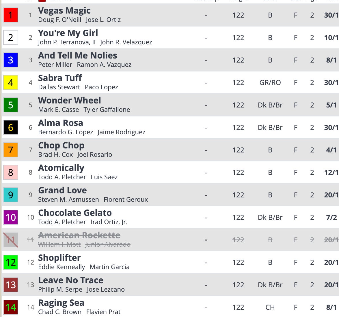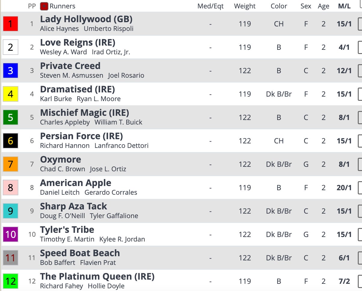 Love Reigns is going to be a popular pick and likely go off as the favorite thanks to Wesley Ward. I know people will look at the 12 too but there's not a lot of Breeders Cup experience there. It's worth noting that Ward has won this race the previous three years. Dude is a monster trainer. Baffert's also in this race with probably my favorite jockey in Flavien Prat and Speed Boat Beach did win out in Santa Anita.