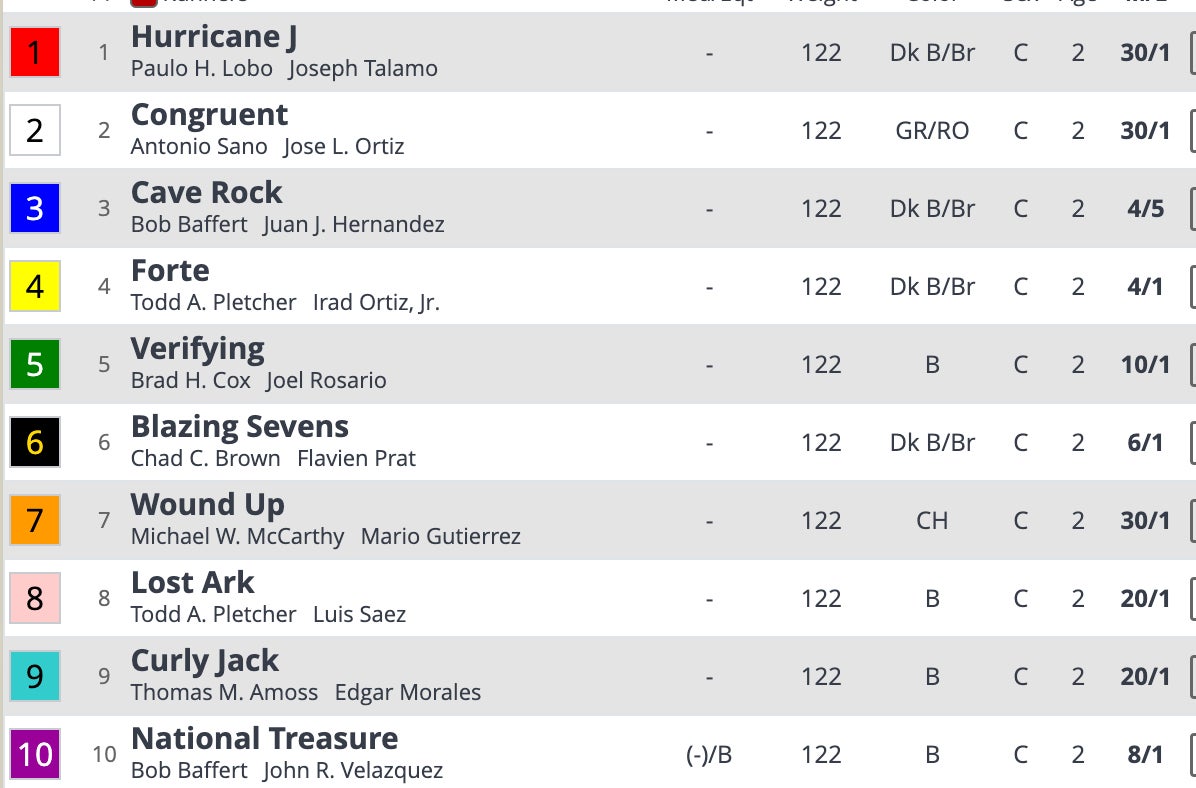 Cave Rock is going to be a popular single here. It makes sense, the horse is 3-for-3 and looks like a monster. You have the Baffert/Hernandez connection. As noted in most places this race is sort of an east coast vs west coast battle and Baffert has won 3 times in the lat 10 years. Cave Rock does have two Grade 1 stakes wins already too - coming at Del Mar and Santa Anita. Again, people are looking at Cave Rock and Flightline (on Saturday) as the two likely singles in horizontal betting.