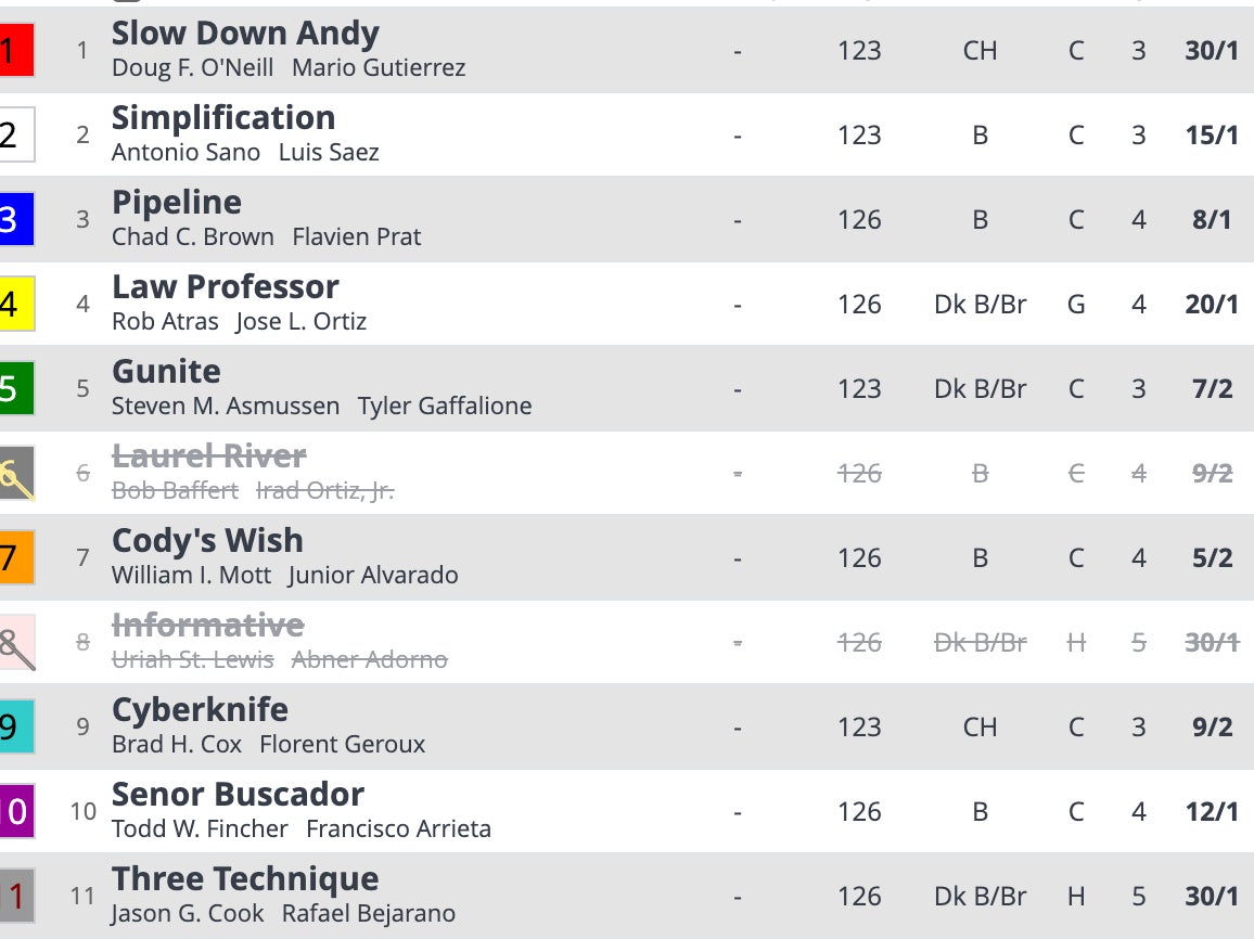 Two well known horses in Simplification and Cyberknife. A football guy in Three Technique. We've seen horses win this and really break out - most notably Knicks Go. Bing Bong. One thing to note here is 3-year olds have been the best in this race. Something to keep an eye on for betting. Laurel River scratching here really opens it up.