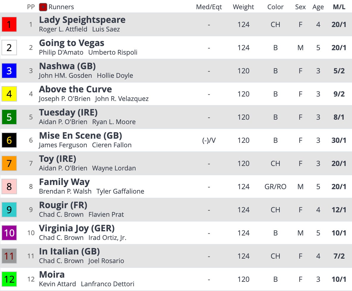 I'm a big fan of what Moira has done. But the thing to note here, this race has been dominated by one of two backgrounds. Foreign horses with a history of winning and/or Chad Brown horses. Brown has won 4 of the last 10 of these races and has a damn good one in In Italian. Foreign horses have won the other 6 races.