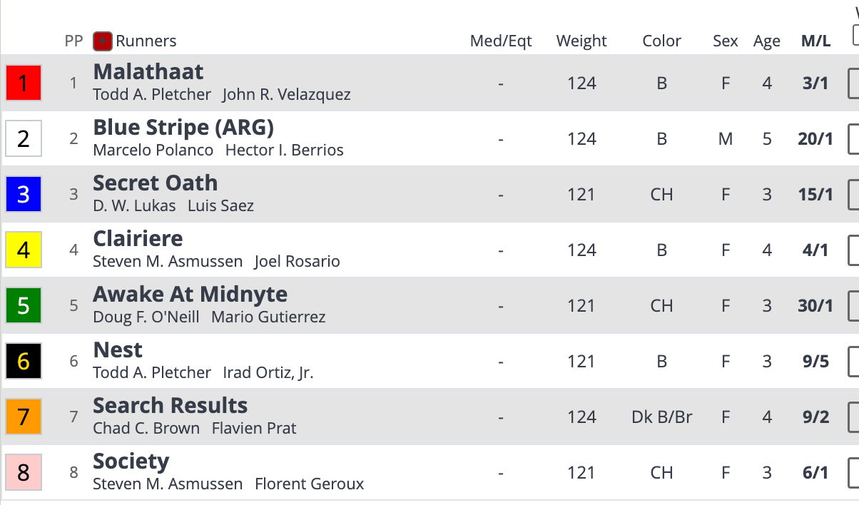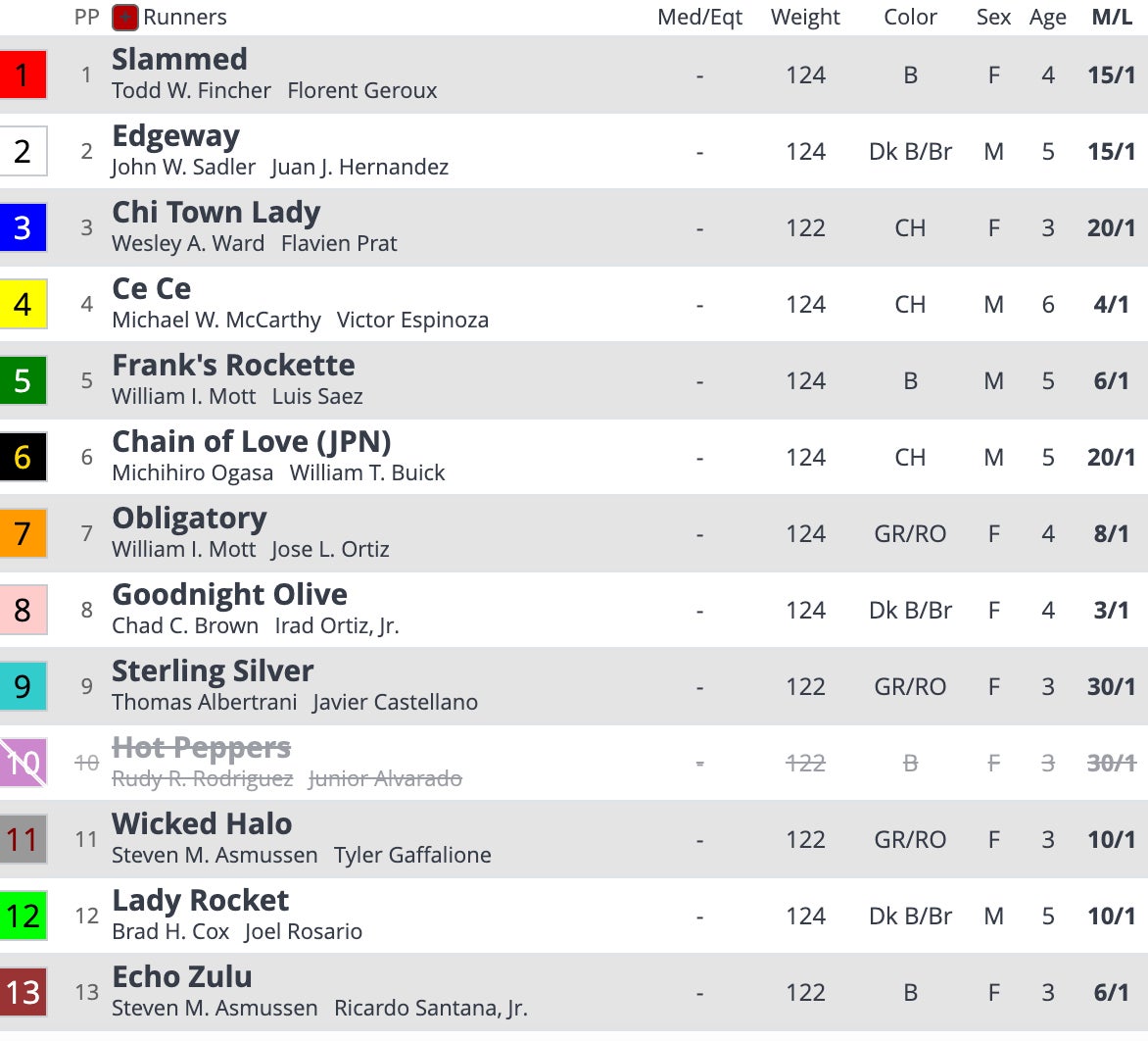 CeCe won this race last year and comes in as one of the favorites again. If it wins it'll be just the second horse to ever win back-to-back in this race. People will likely know the names of Echo Zulu, Lady Rocket and Edgeway. The favorite is going to be Chad Brown and Irad on Goodnight Olive.
