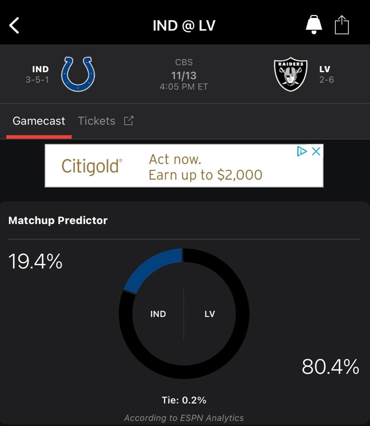 I can't say I am overly surprised by this. After losing 26-3 to an average New England Patriots team, I came to the realization that the Colts might be the worst team in the National Football League. At least bottom 5. I wrote about this yesterday, but over 80% of the general public thinks were going to lose to the 2-6 Raiders next week.