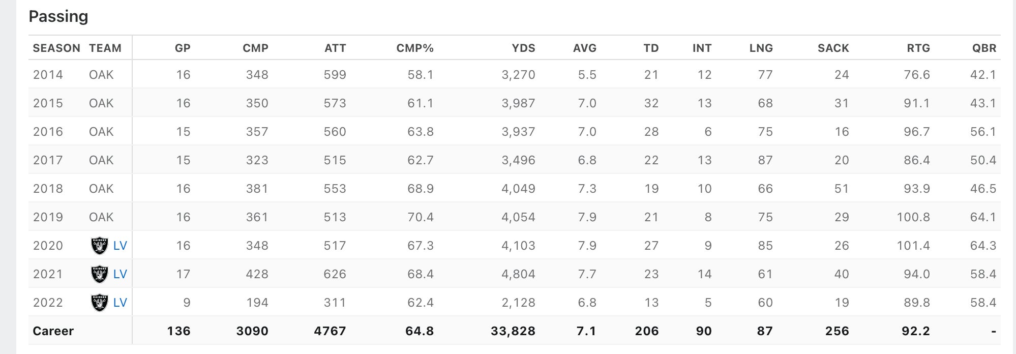 Just this year alone Carr is 14th in yards, 24th in completion percentage, 11th in touchdowns, 15th in quarterback rating. That screams I'm an average quarterback and 100% part of the reason we don't have a ton of success. I know people will say Renfrow and Waller were hurt. Sure, they are the only two key players in the entire league that have missed time.