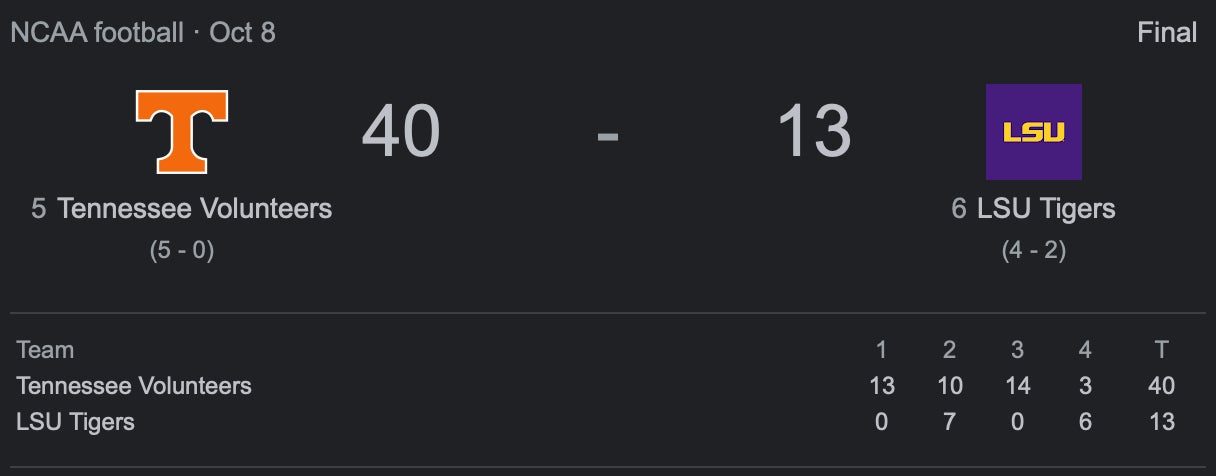 Tennessee went into Death Valley and absolutely dominated LSU on October 8. Just beat the Tigers senseless and embarrassed them on their home field. This was not an overtime game that could have gone either way or one that was "closer than the score indicates." It was a thrashing.
