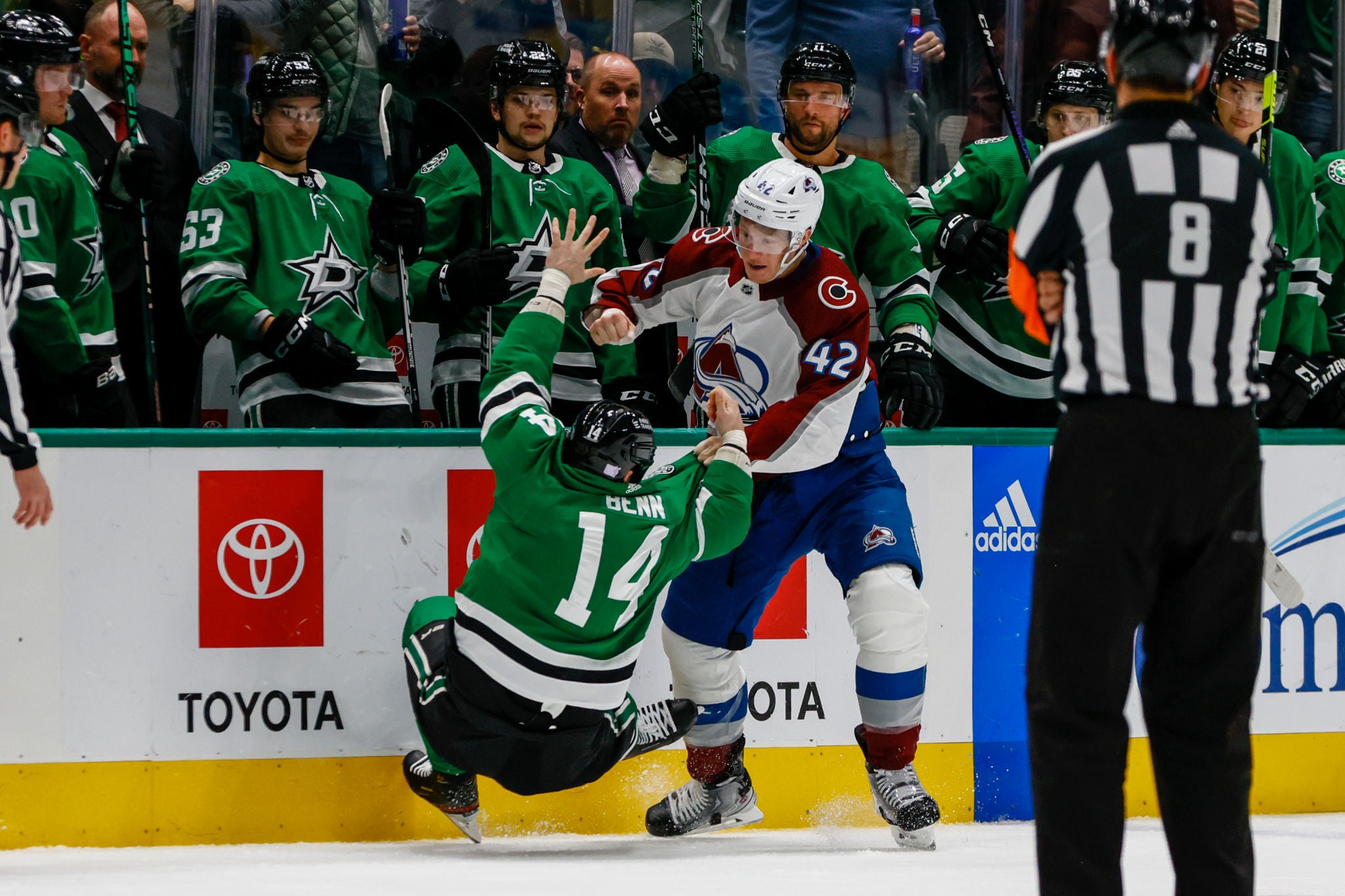 Jamie Benn. Their captain. The big fella. Not a guy who is typically known for going down on the ice nor off the ice. And he just gets completely buckled right in front of the bench. Let's take a look at the tape.