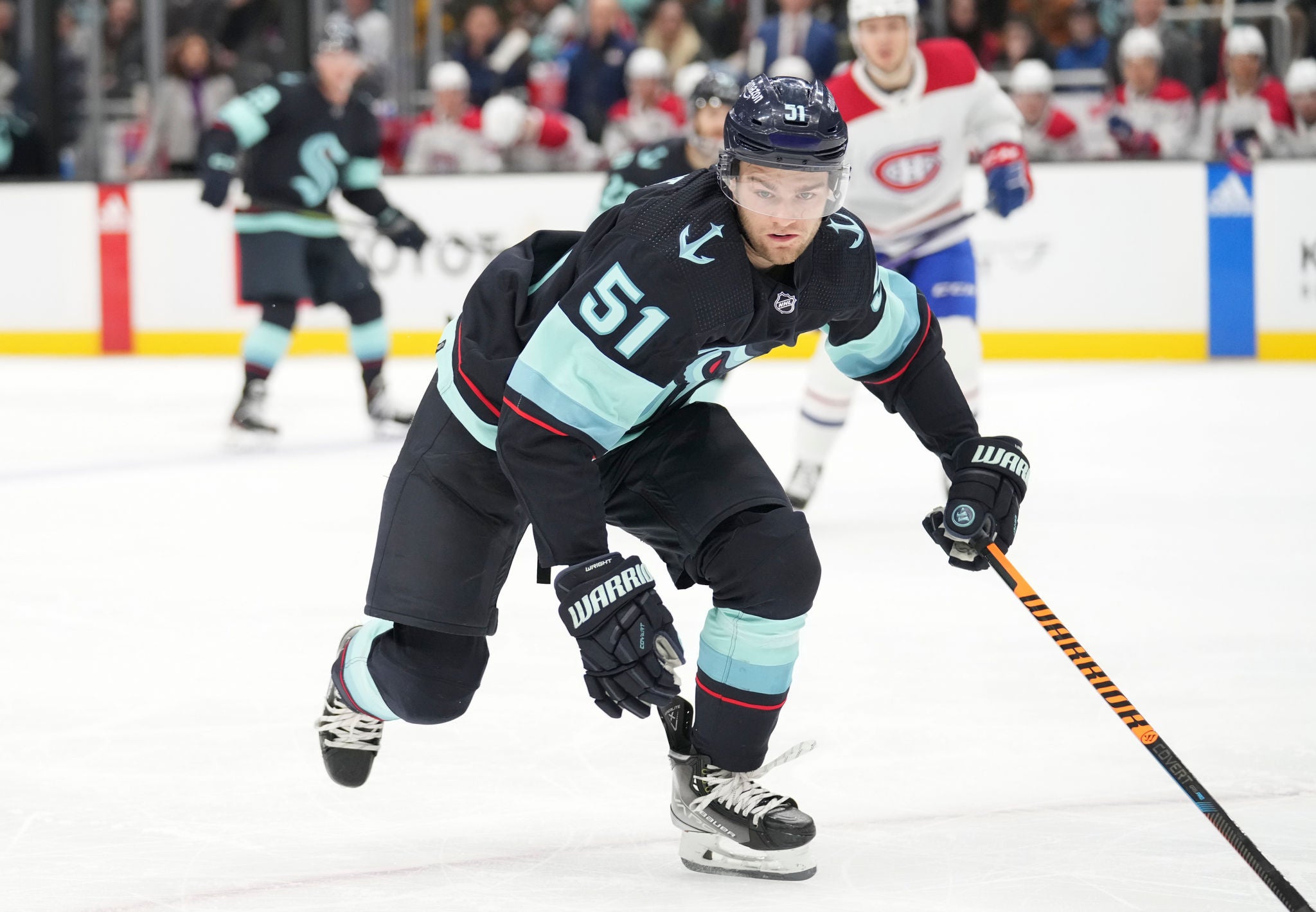 Now once the season got started, it seemed like Montreal made the right decision. Shane Wright wasn't able to work his way into Seattle's lineup on a nightly basis, was watching most of the games from the press box, and eventually got sent down to the AHL for a few games. But after 4 goals in 5 games with the Coachella Valley Firebirds, Shane Wright got the called back up to the Kraken for last night's game against Montreal. 15 minutes into the night…