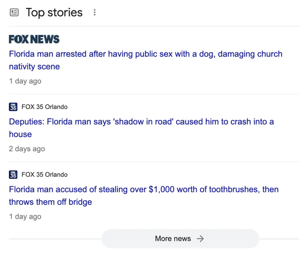 I did a quick Google of "Florida Man headlines" and these were just from the last two days.