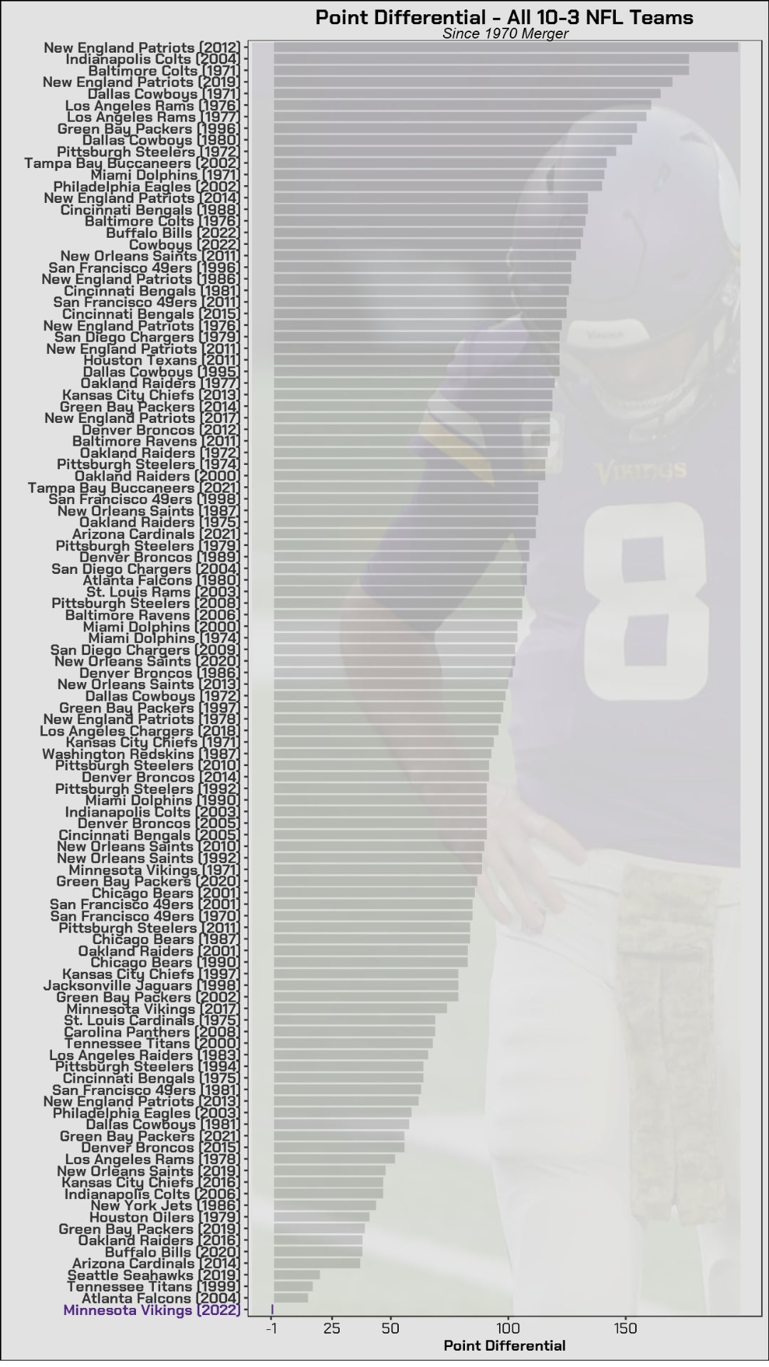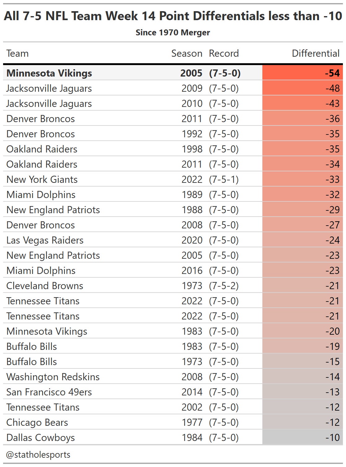 Unsurprisingly, the aforementioned Giants and Titans found themselves at the scene of this crime too. But just like Frank Abagnale Jr., the Vikings have been running scams for years. For the Vikings - it's been the same old point differential gig. I mentioned the Giants have the 8th worst point differential of any 7-5 team ever. Want to know what franchise is not only the current biggest 10-3 fraud ever but also the biggest 7-5 fraud ever?