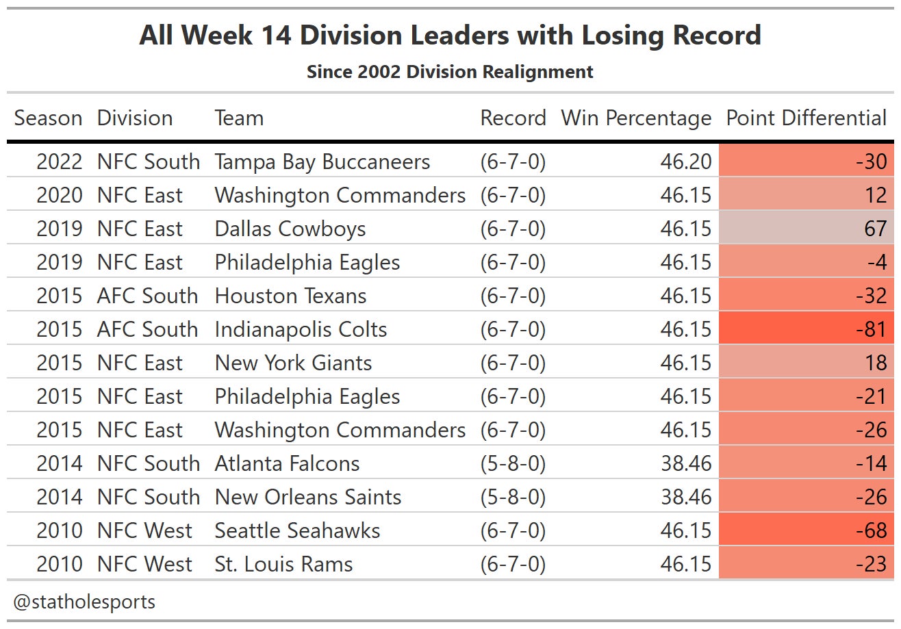 Since the 2002 division realignment, there have only been six divisions who's leading team after Week 14 was below .500. That was before the Bucs made the 2022 NFC South the 7th on Sunday. Here are the leading teams from all such divisions without considering tie breakers.