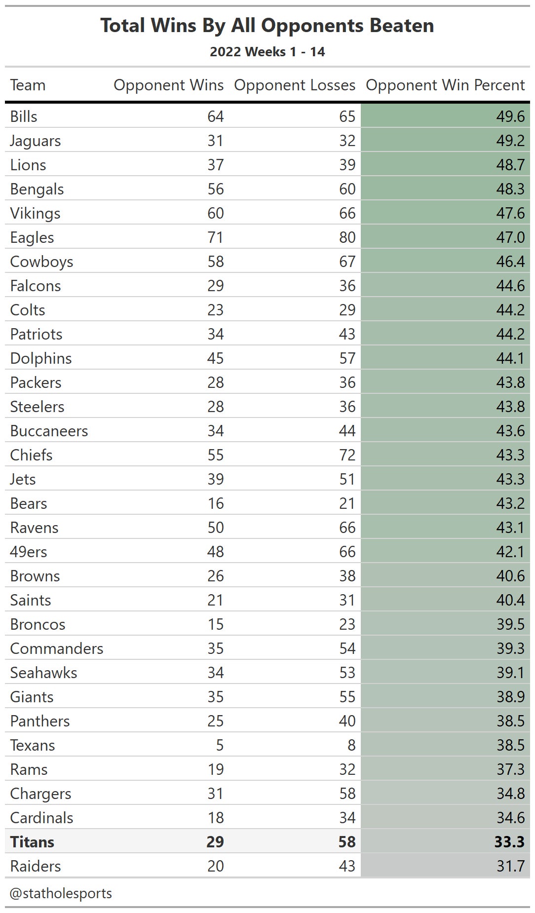 The Titans might be on top in the AFC South, but their prize win so far came against the 7-5 Washington Commanders. The scam they've been running is just that they beat the bona fide shitty teams on their schedule with a healthy mix of excellent coaching and no name players outside of Derrick Henry. The stats back this claim up. Below I crunched the average win percentage for all NFL team's teams beaten. For example, I took all the teams Tennessee beat and totaled those teams wins and loses and averaged them out. And as you can see the Titans beaten opponents have the second worst record in the NFL: